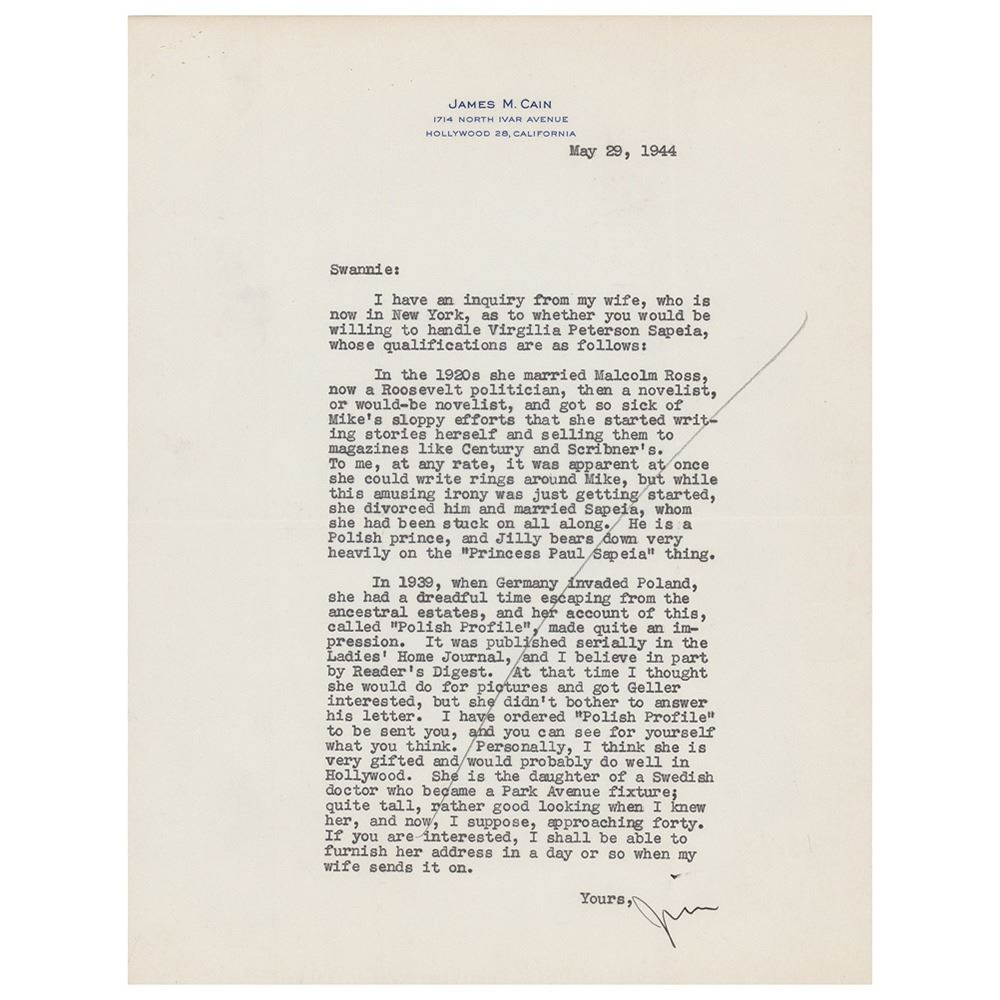 TLS, one page, 8.5 x 11, personal letterhead, May 29, 1944. Letter to literary agent H. N. Swanson, in full: "I have an inquiry from my wife, who is now in New York, as to whether you would be willing to handle Virgilia Peterson Sapeia, whose qualifications are as follows: