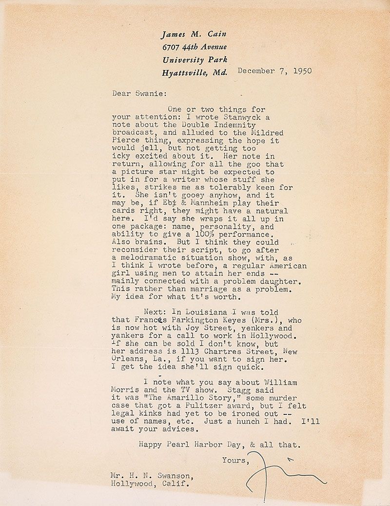 TLS signed “Jim,” one page, 8.5 x 11, personal letterhead, December 7, 1950. Letter to an admirer. In part: “I wrote Stanwyck a note about the Double Indemnity broadcast, and alluded to the Mildred Pierce thing, expressing the hope it would jell, but not getting too icky excited about it. Her note in return, allowing for all the goo that a picture star might be expected to put in for a writer whose stuff she likes, strikes me as tolerably keen for it…I’d say she wraps it all up in one package: name, personality, and ability to give a 100% performance. Also brains.” An overall block of irregular toning and staple holes to the top, otherwise fine condition.