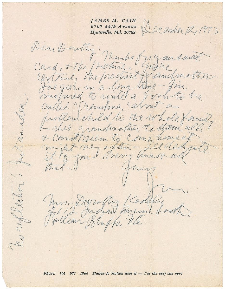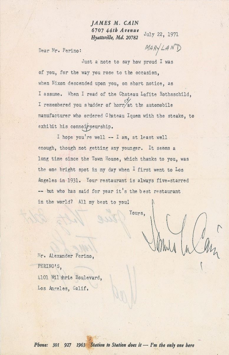 American novelist (1892–1977) best known as the author of such crime/noir classics as The Postman Always Rings Twice and Double Indemnity. Two letters: an ALS signed “Jim,” one page, 8.5 x 11, personal letterhead, December 12, 1973, in part: “Thanks for your sweet card, & the picture. You’re certainly the prettiest grandmother I’ve seen in a long time—I’m inspired to write a book to be called ‘Grandma,’ about a problem child to the whole family—she’s grandmother to them all”; and a TLS signed “James M. Cain,” one page, 8.5 x 11, personal letterhead, July 22, 1971, in part: “Just a note to say how proud I was of you, for the way you rose to the occasion, when Nixon descended upon you, on short notice, as I assume. When I read of the Chateau Lafite Rothsschild [sic], I remembered you shudder of horror at the automobile manufacturer who ordered Chateau Iquem [sic] with the steaks, to exhibit his connoisseurship.” Cain makes a few handwritten corrections to the text. In overall fine condition, with scattered folds and creases.