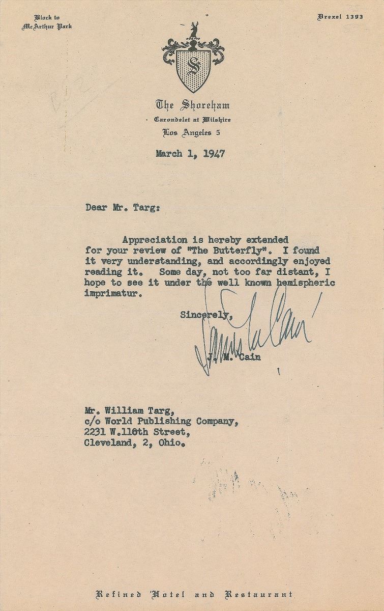 American novelist (1892–1977) best known as the author of such crime/noir classics as The Postman Always Rings Twice and Double Indemnity. TLS, one page, 6 x 9.5, The Shoreham letterhead, March 1, 1947. Letter to William Tang, in full: “Appreciation is hereby extended for your review of ‘The Butterfly.’ I found it very understanding, and accordingly enjoyed reading it. Some day, not too far distant, I hope to see it under the well known hemispheric imprimatur.” In fine condition.