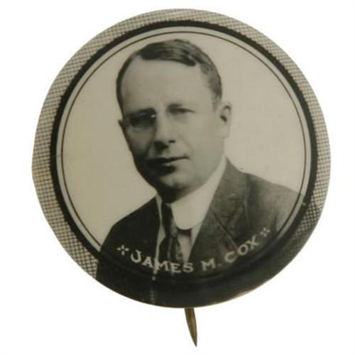 <B>James M. Cox: 1 1/4" Portrait Button</B></I> A very nice example picturing Cox in black and white with gray tones. A tough one to find this nicely centered.<BR><BR><b>Shipping:</b> Miscellaneous Collectibles, Smal (<a target="_blank" href="http://www.heritageauctions.com/common/shipping.php">view shipping information</a>)