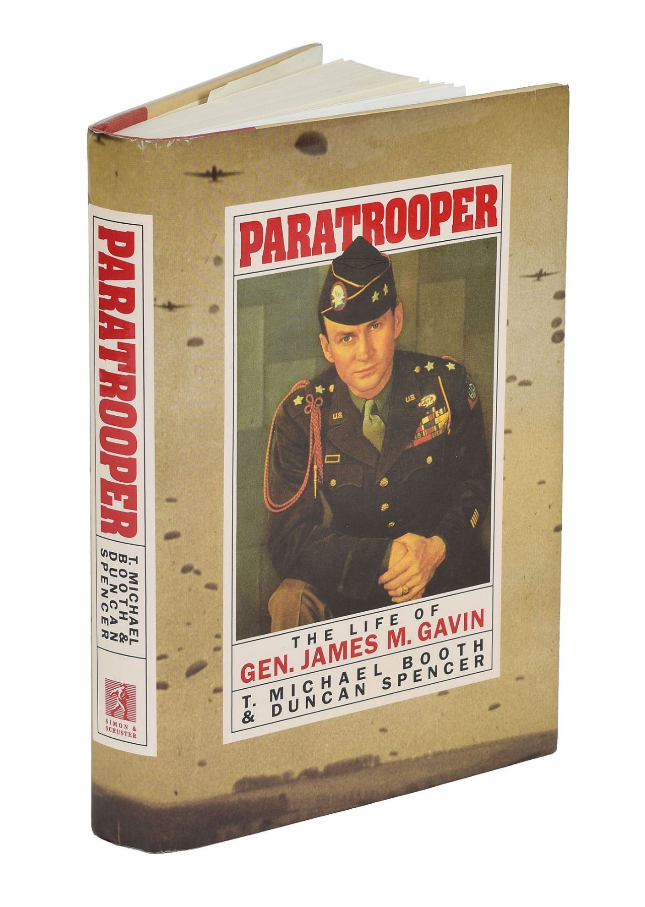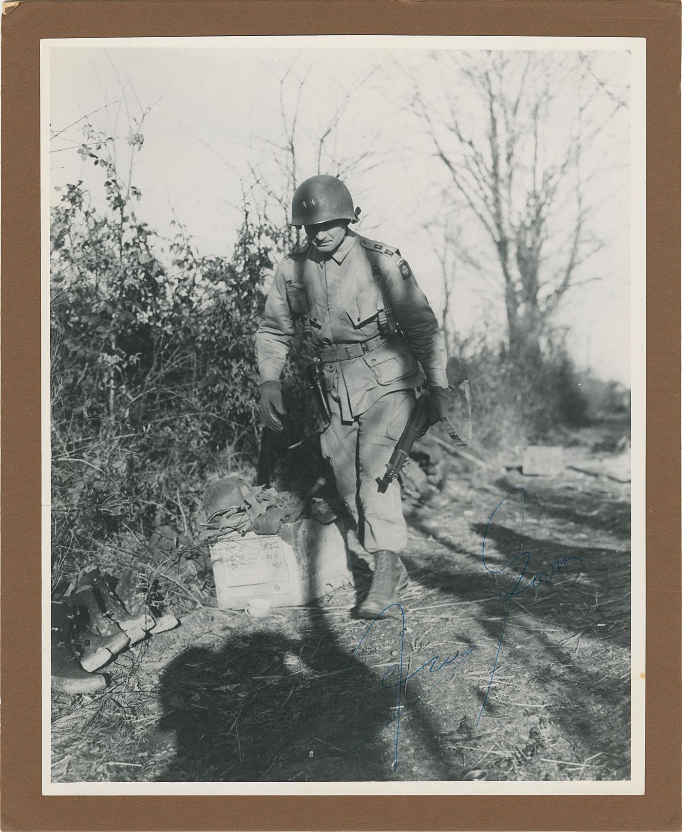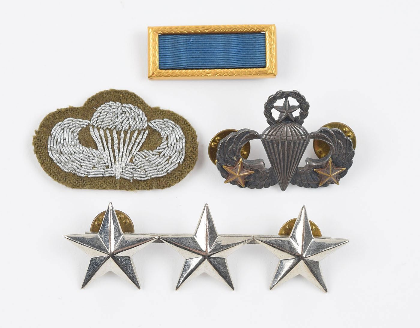 Group lot of military insignia belonging to General James Gavin, commander of the 82nd Airborne Division during World War II, including: a sterling silver Master Paratrooper Badge/Jump Wings with stars indicating two combat jumps; an Army Lieutenant general Air Force three-star rank badge; a Basic Paratrooper patch; and a blue military citation pin. Also includes: a glossy 8 x 10 full-length photo of Gavin walking in full uniform during wartime, signed in blue ballpoint, “James Gavin”; and a TNS on an off-white 5 x 3 card, signed “James Gavin,” in full: “Enclosed please find a pair of my jump wings, overseas hat & misc insignia. I hope that they add to your very fine and I must say complete collection.” In overall fine condition. Accompanied by three unsigned items: a glossy 8 x 10 photo of Lt. Gen. Gavin posing with various models, with a US Army caption label affixed to reverse and dated January 22, 1958; a copy of Life magazine from August 4, 1958, showing a large image of Gavin on the front cover with text reading: “’We Are In Mortal Danger,’ General Gavin Cites Tragic Errors In Plans For Limited Or Major War”; and a first edition copy of Paratrooper: The Life of Gen. James M. Gavin, hardcover with dust jacket, published by Simon and Schuster in 1994.