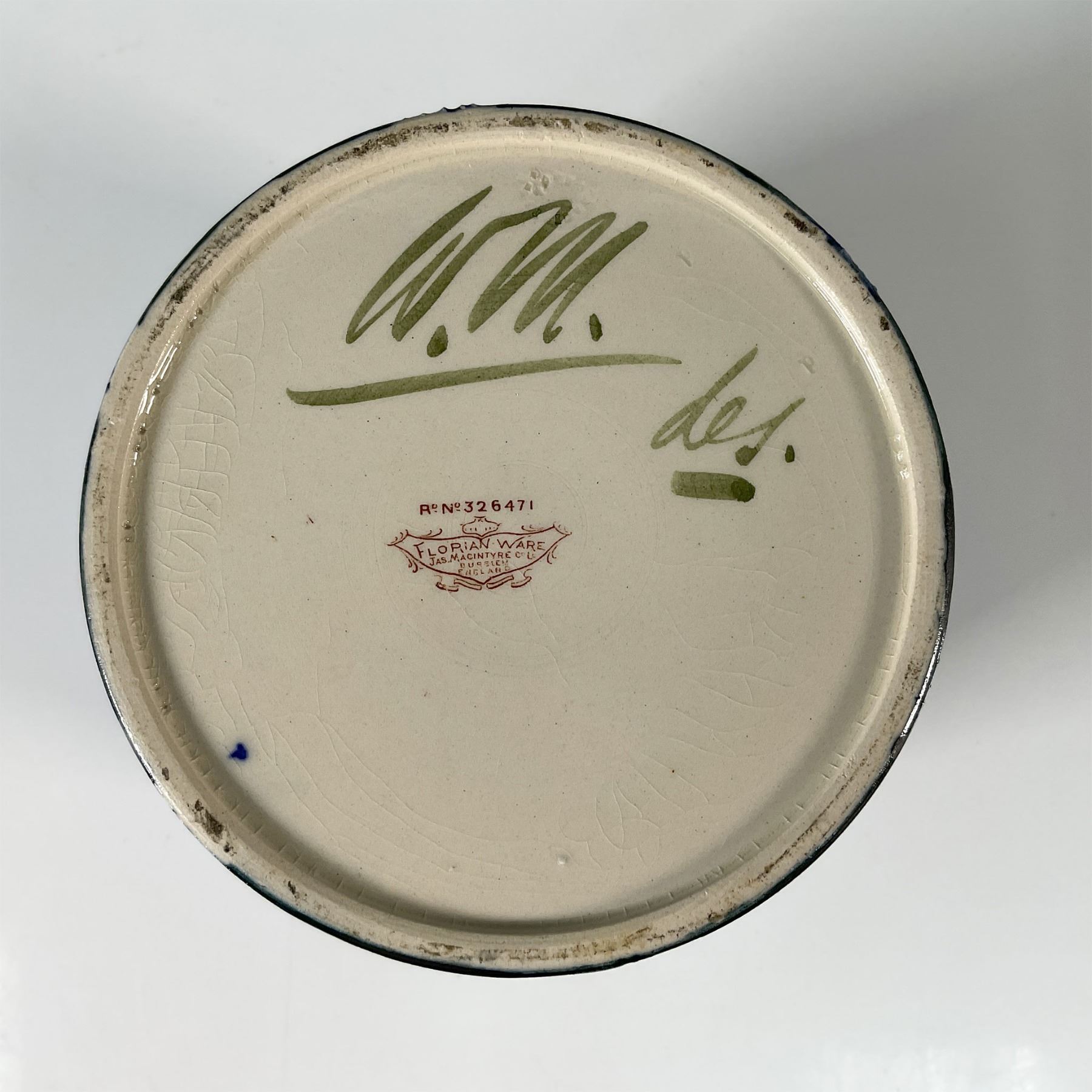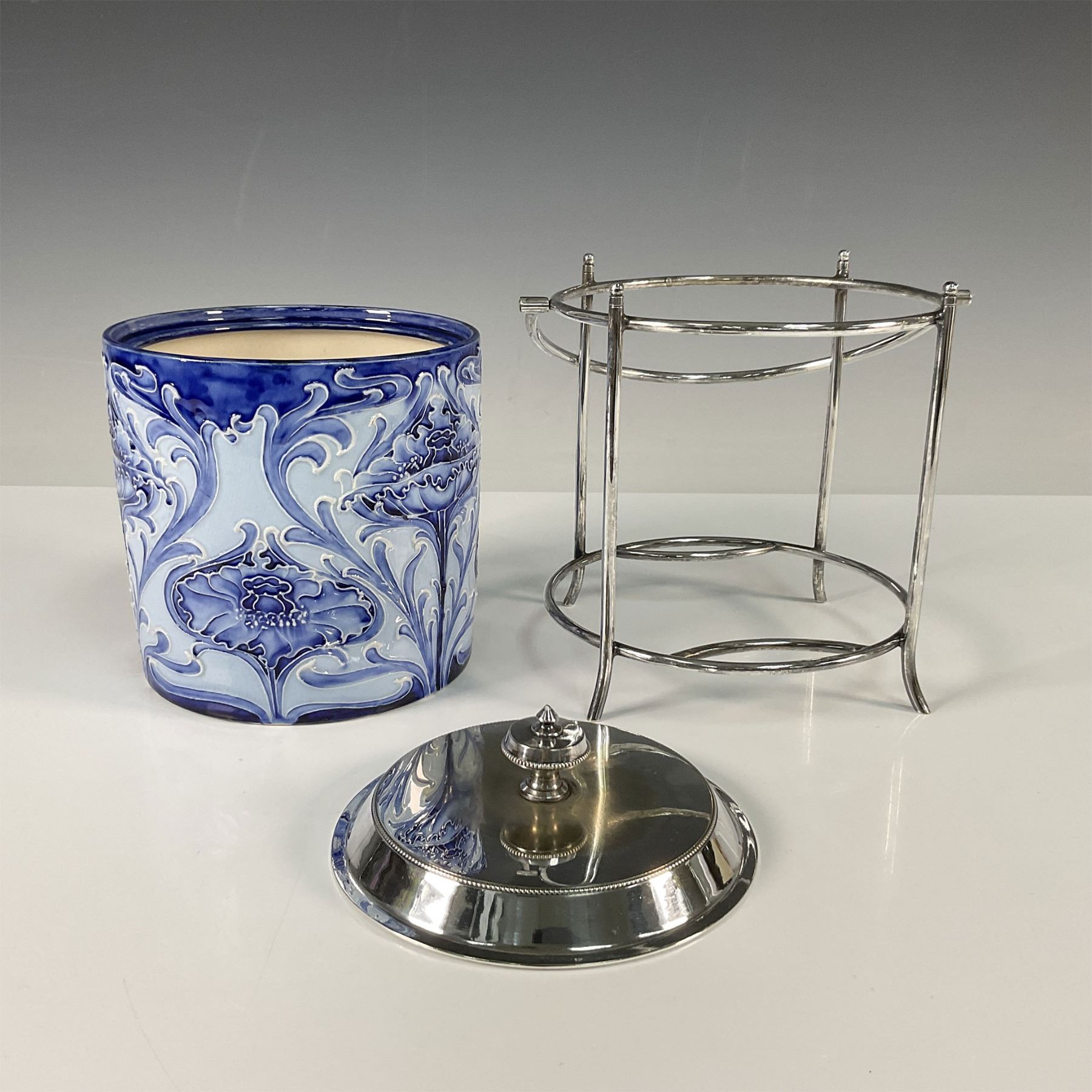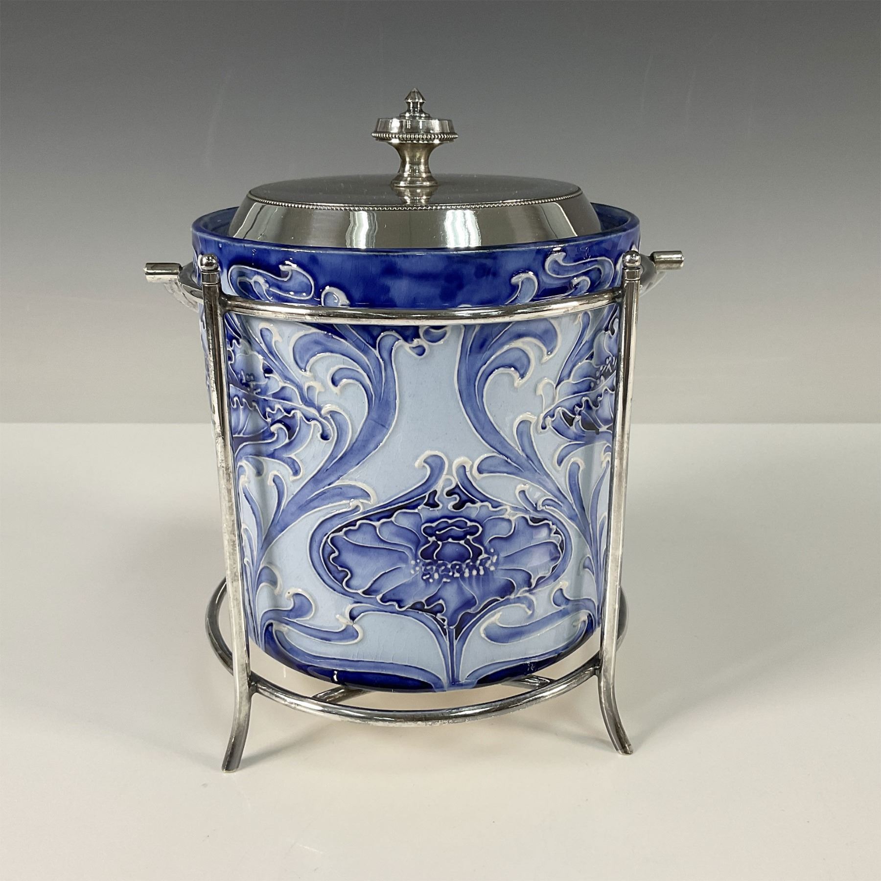 James Macintyre Florian Ware Biscuit Barrel by William Moorcroft with James Dixon & Sons electroplated-silver frame. This rare and exquisite Florian Ware biscuit barrel, designed by the celebrated artist William Moorcroft for James Macintyre & Co., features a striking Art Nouveau design with blue floral motifs and intricate detailing. The hand-painted design exemplifies Moorcroft's early mastery of ceramics, highlighted by the signature tubelining technique and rich blue hues. The piece is complemented by a stylish James Dixon & Sons electroplated-silver frame, adding elegance and functional appeal. James Macintyre backstamp. Artist signed. James Dixon & Sons hallmark.