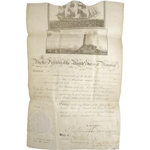 <B>James Madison 1810 Ship’s Passport Document Signed</B></I> “<I>James Madison</B></I>”. One page, 10.25” x 15.75”, printed on vellum, New York, March 29, 1810, countersigned by “<I>R Smith</B></I>” (Secretary of State), with seal of the United States intact, vignettes of a lighthouse and harbor scene and a sailing ship, vellum toned at the edges, fold creases, ink slightly faded, else very good. This document guarantees safe passage for the Brig <I>Olympus</B></I>, a 169 ton sailing ship with a crew of nine under the command of Edmund Funnino of New York and allows her “To Pass with her Company Passengers Goods and Merchandise without hinderance seizure or molestation”. <BR><BR><BR><b>Shipping:</b> Flat Material, Small (<a target="_blank" href="http://www.heritageauctions.com/common/shipping.php">view shipping information</a>)