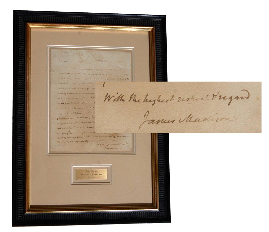 James Madison autograph letter signed, dated 9 June 1823 from Montpelier, Virginia, where he retired. Here, Madison gives a strong recommendation for a Mr. Morris, who worked on a confidential mission in Spain under Madison. Letter reads in part, ''...Mr. Morris who was employed for several years on a confidential mission to Spain, observes to me that in executing the trust, he incurred expenses particularly in being transferred from Cadiz to Madrid and during his residence at the latter place, which in the known circumstances of Spain were great beyond foresight...I cheerfully bear my testimony to the claim given to him by the intelligence in the integrity and the respectability belonging to his character. / James Madison''. Letter has some toning throughout, with small tears and an area of paper loss to the edges. Document has been de-acidified and archivally framed. Very good condition.