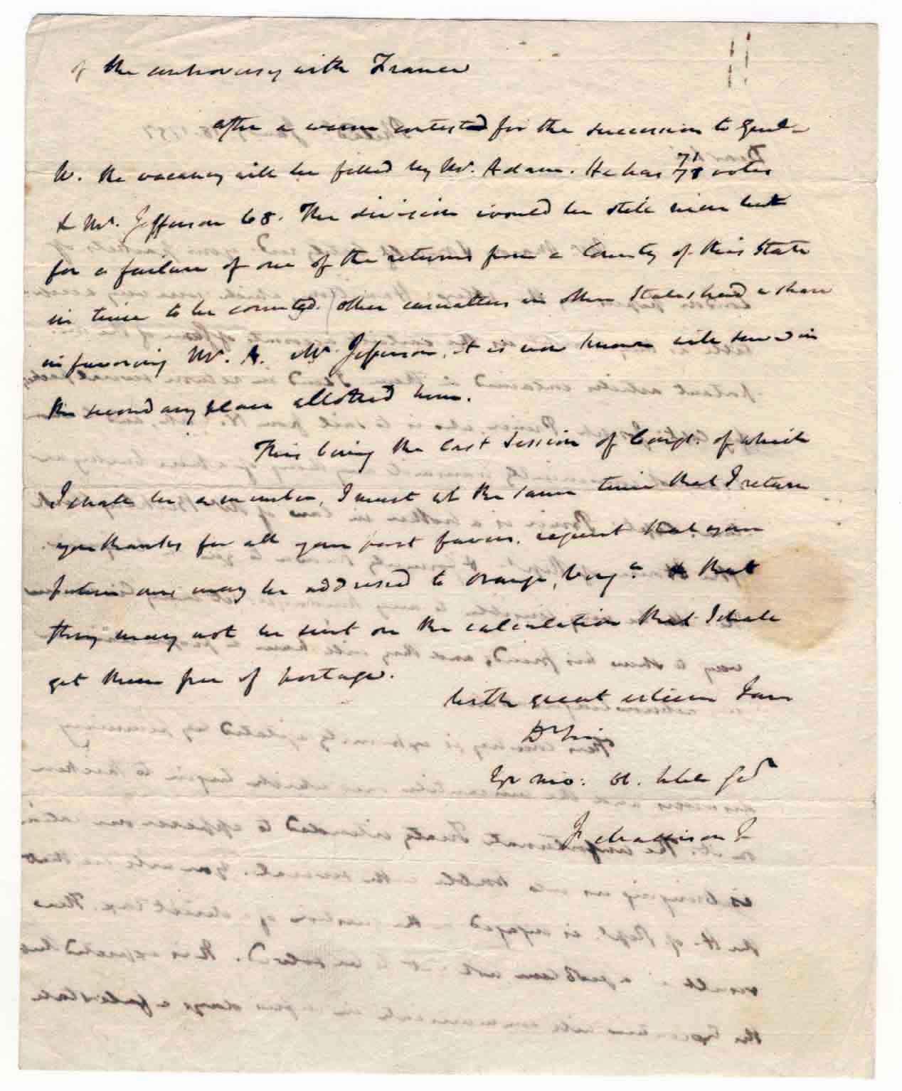 Fantastic, historically important autograph letter signed by James Madison, fourth President of the United States, regarding the election to determine the second President. According to Madison, late returns filed by the state of Virginia resulted in John Adams securing more votes than his opponent, Thomas Jefferson. Apparently, Jefferson did not contest the results, and took the second position of Vice President instead -- the only time in our nation's history when the President and Vice President were from opposing political parties. Letter dated 18 January 1797 to an unnamed recipient reads in part, ''Dear Sir, W. Mason and myself lately recd your packets of London papers by Mr. Alex. Hamilton, which were very acceptable as they brought in the the earliest accounts of the important articles contained in them…This country is extremely agitated by pecuniary distresses, and the mercantile ones which begin to thicken on it. The unfortunate Treaty intended to appease our nation is bringing us into trouble with several. You will see that Mr. H. of Rep. is engaged on the question of a direct tax. The result is a problem not yet to be solved. It is expected that the executive will communicate in a few days a [?] of the embassy with France. After a warm contest for the succession to Gen'l W[ashington] the vacancy will be filled by Mr. Adams. He has 71 votes & Mr. Jefferson 68. The division would be still even but for a failure of one of the returns from a County of this State [Virginia] in time to be counted. Other casualties in other States had a hand in favoring Mr. A. Mr. Jefferson, it is now known, will serve in the secondary place allotted him…'' Signed at the conclusion ''J. Madison Jr.'' This first Presidential election (George Washington was uncontested) set the stage for acrimonious, or ''warm'' political contests, with a purported covert campaign by Alexander Hamilton to sway southern voters to pledge their second vote to Thomas Pinckney, which Hamilton and his supporters hoped would catapult Pinckney to the Presidency over Adams. Though unsuccessful, the election was extremely close and, as this letter shows, should have resulted in a tie with Thomas Jefferson perhaps becoming the 2nd President of the United States should there have been a recount! Exceptional, museum-worthy letter from America's embryonic days as a democratic republic. Two page letter, front and verso, measures 8'' x 10''. In very good to near fine condition with bleedthrough of ink and expected mailing folds.