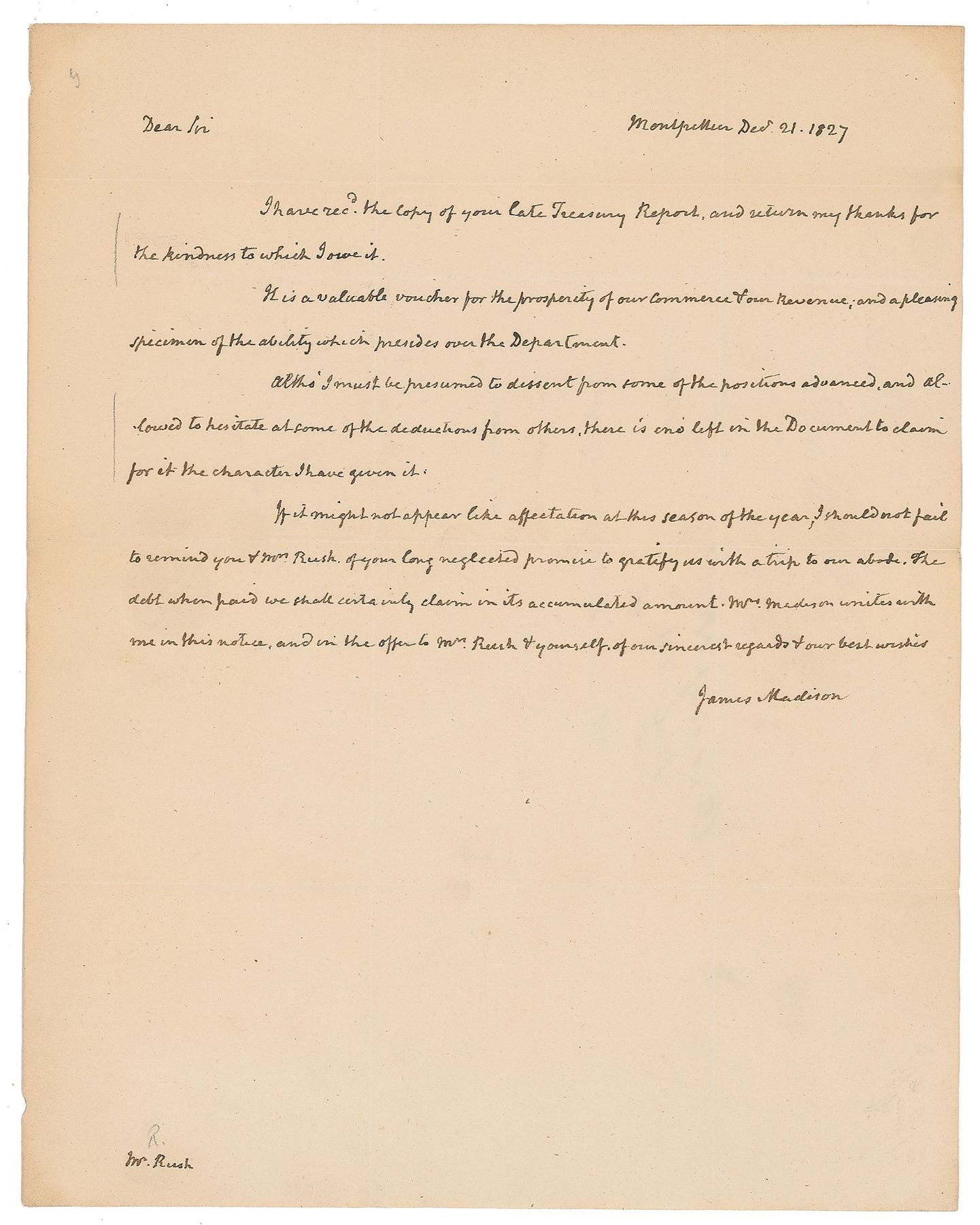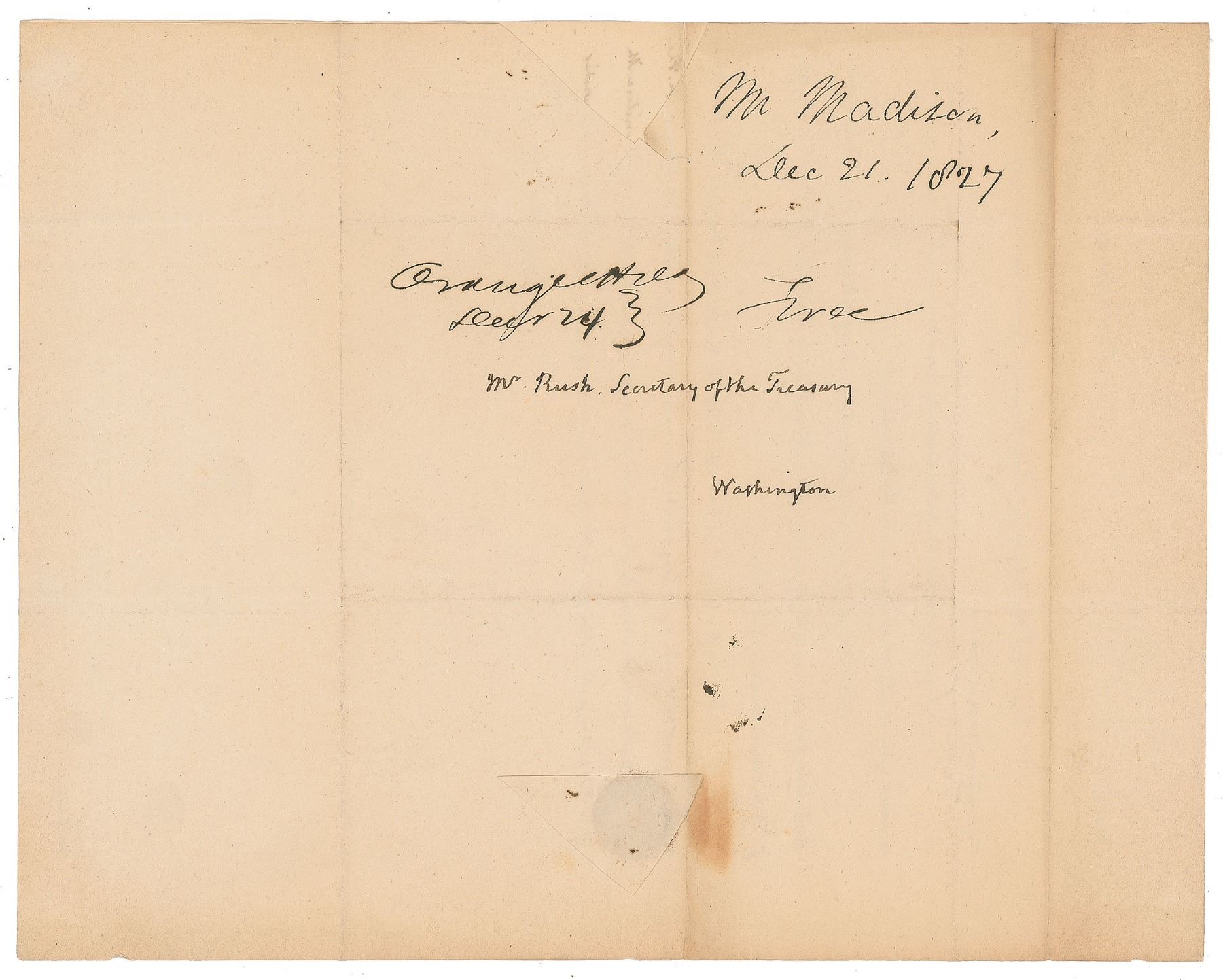 ALS, one page, 7.75 x 9.75, December 21, 1827. Written from Montpelier, a letter to Richard Rush, the United States Secretary of the Treasury, in full: "I have rec'd the copy of your late Treasury Report, and return my thanks for the kindness to which I owe it. It is a valuable voucher for the prosperity of our commerce & our revenue, and a pleasing specimen of the ability which presides over the Department. Altho' I must be presumed to dissent from some of the positions advanced, and allowed to hesitate at some of the deductions from others, there is eno' left in the Document to claim for it the character I have given it. If it might not appear like affectation at this season of the year, I should not fail to remind you & Mrs. Rush of your long neglected promise to gratify us with a trip to our abode. The debt when paid we shall certainly claim in its accumulated amount. Mrs. Madison unites with me in this notice, and in the offer to Mrs. Rush & yourself of our sincerest regards & our best wishes." In very good to fine condition, with light creasing, and seal-related paper loss to the integral address leaf.