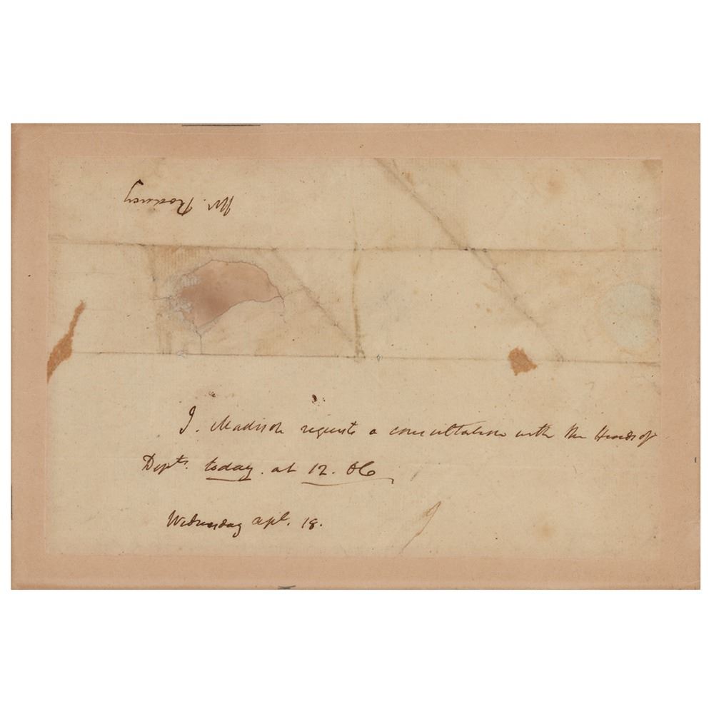 Unusual third-person ANS as president, signed “J. Madison,” one page, 7.75 x 5, Wednesday, April 18 [1810]. A brief handwritten note addressed to “Mr. Rodney,” calling for an impromptu cabinet meeting for noon on that day. In full: “J. Madison requests a consultation with the Heads of Depts. today at 12. O.C.” Professionally inlaid into a slightly larger sheet and in very good to fine condition, with creases, small stains, and areas of professional restoration.
