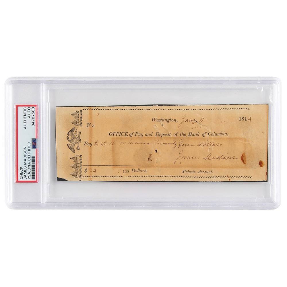Office of Pay and Deposit of the Bank of Columbia check, 7.25 x 2.5, filled out and signed by Madison as president, "James Madison," payable to "A. R. or bearer" for $24, January 11, 1814. In very good condition, with irregular toning, and scattered staining and soiling. Encapsulated in a PSA/DNA authentication holder.