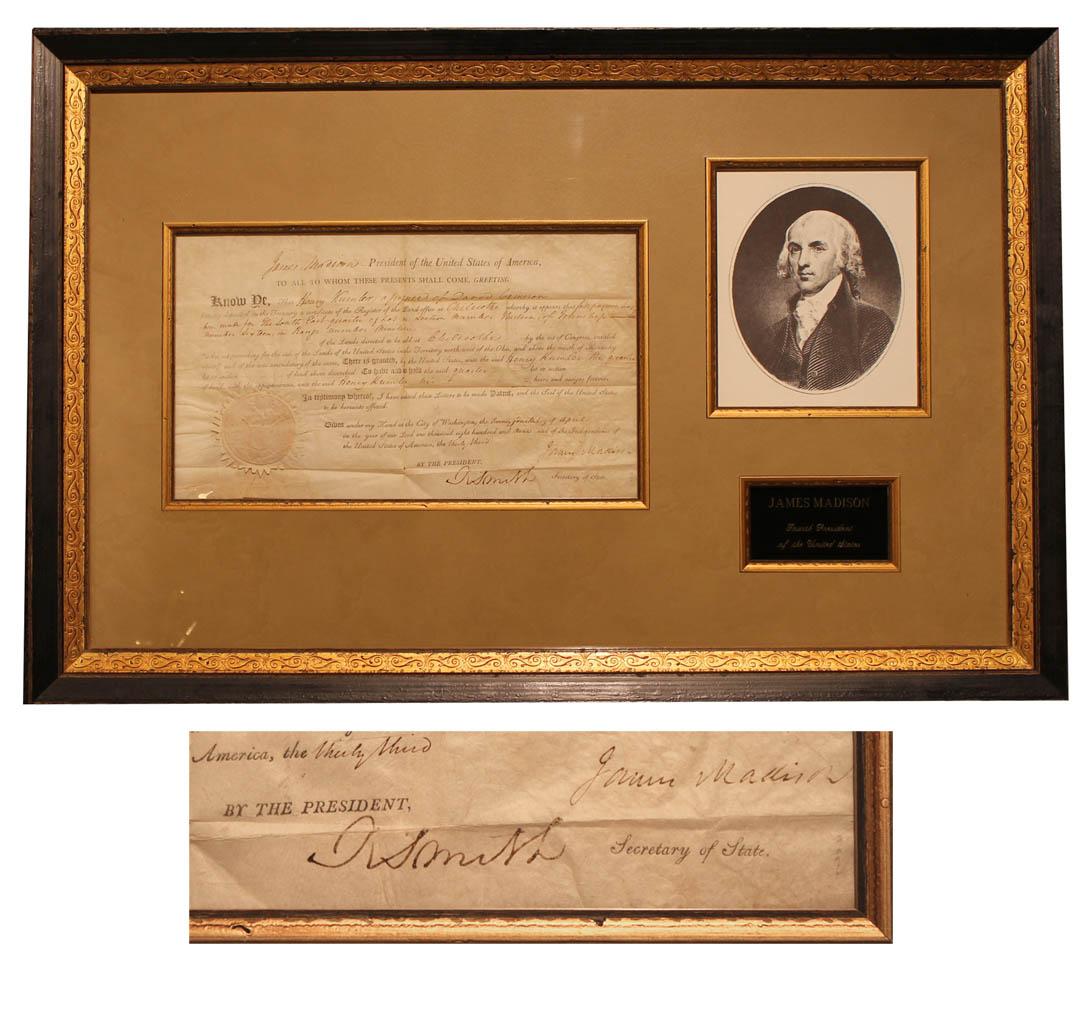 Presidential land grant signed ''James Madison'', dated 24 April 1809. Also signed by Secretary of State Robert Smith. Document grants a Mr. Henry Kumler a portion of land in Chillicothe, Ohio. Document, on vellum paper with intact U.S. blindstamped seal, measures 14.25'' x 8''. Folding and toning, otherwise near fine condition. Rich gold and chocolate-colored wood frame with taupe mat measures 31.5'' x 20.5''. Also includes portrait engraving of the 4th President and placard of his name.