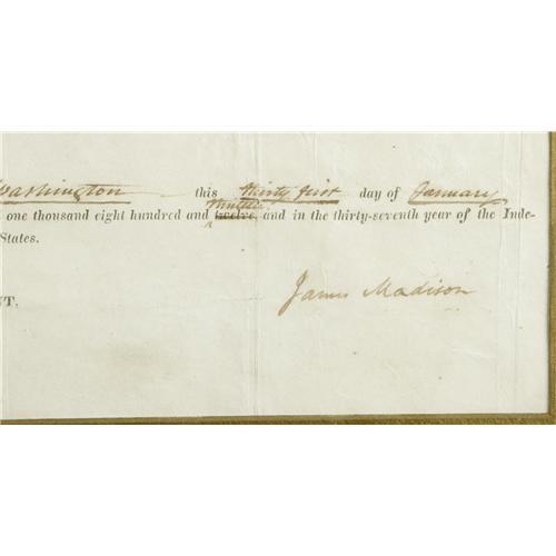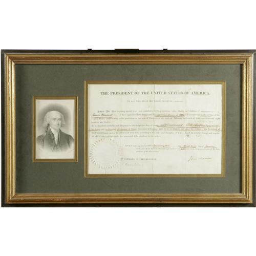 <B> James Madison Document Signed.</B></I> One page U.S. Army commission, 13.0" x 8.5", Washington, D.C., January 31, 1813. Partially printed, this is a scarce and splendid War of 1812 commission naming James Bennett a 2nd Lieutenant of Volunteers. Archival tape repairs along split folds and under one small area of paper loss. Browning as expected. Good condition. Matted and framed with engraving of Madison. 24.0" x 15.0" overall.