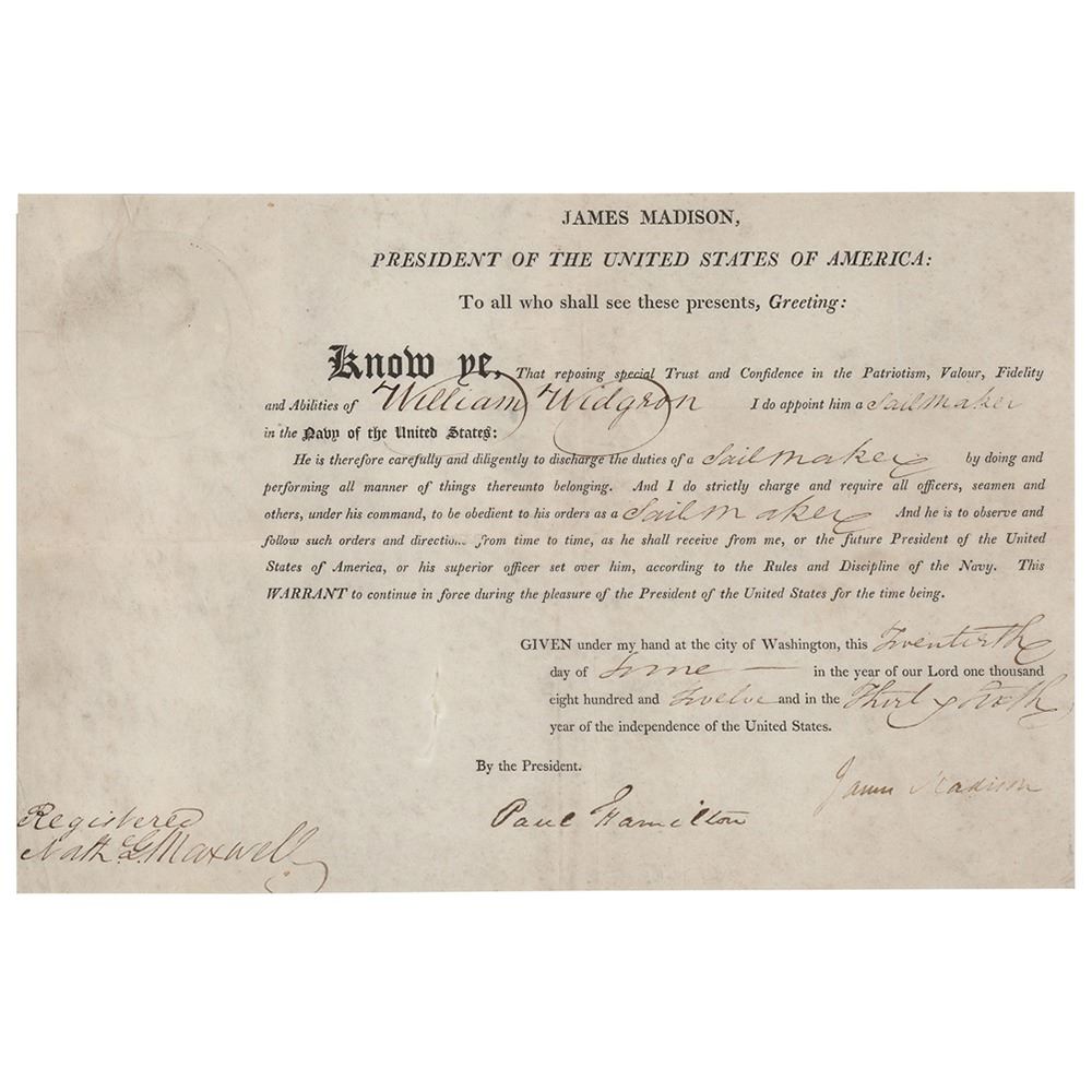 Partly-printed vellum DS as president, one page, 11.5 x 7.75, June 20, 1812. President Madison appoints William Widgeon as "a sailmaker in the Navy of the United States." Signed at the conclusion by President Madison and countersigned by Secretary of the Navy Paul Hamilton. In very good to fine condition, with light soiling and trimmed edges. Widgeon was assigned to the USS Constitution, serving as its sailmaker from July 3, 1812–June 22, 1815. He was one of the few members of Constitution’s War of 1812 crew who served during all of the ship’s battles: he was on board Old Ironsides during her engagements with HMS Guerriere on August 19, 1812, with HMS Java on December 29, 1812, and with HMS Cyane and HMS Levant on February 20, 1815.