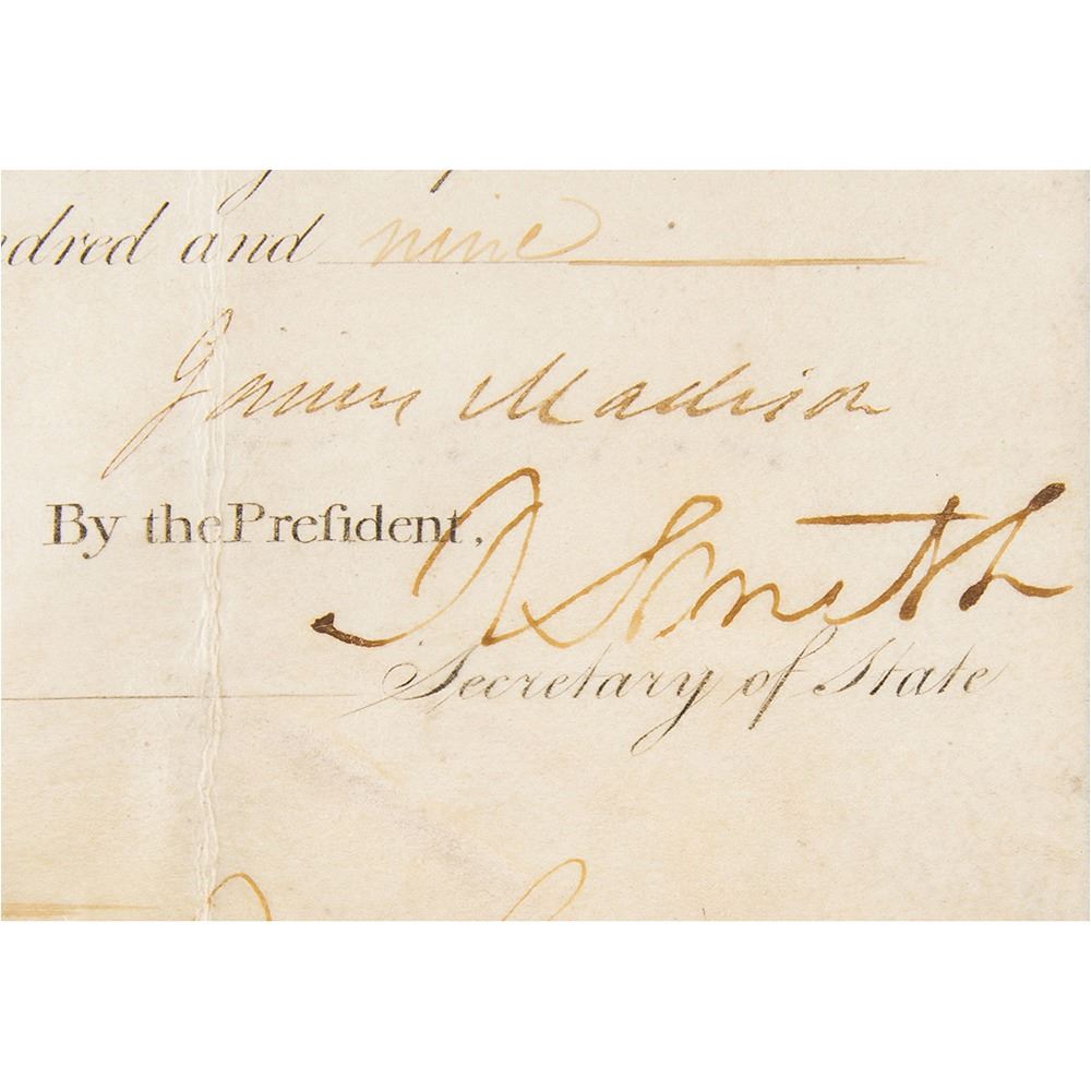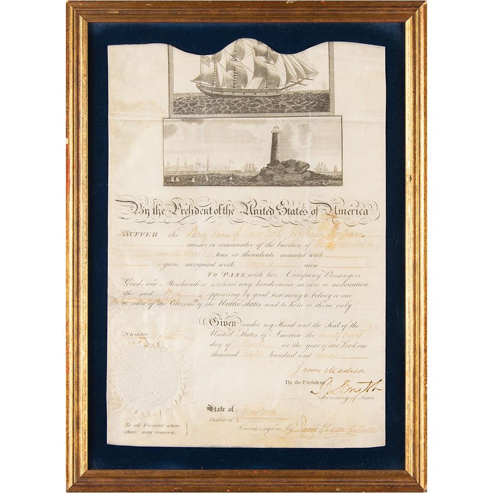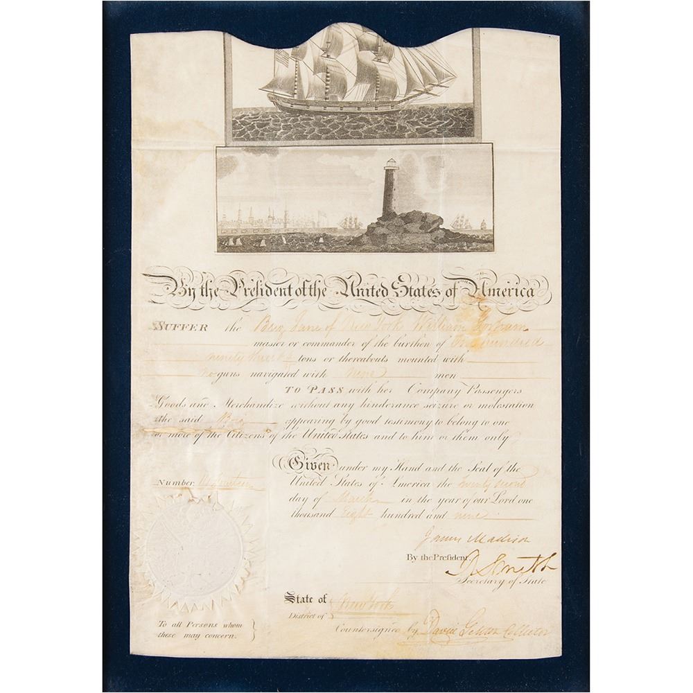 Partly-printed vellum DS as president, one page, 10 x 15, March 22, 1809. Scalloped-top ship's pass issued to the "Brig Jane of New York, William Gorham master or commander…navigated with nine men to pass with her Company, Passengers, Goods and Merchandize without any hinderance seizure or molestation." Signed at the conclusion by President Madison and countersigned by Secretary of State Robert Smith. Lower left corner retains the original embossed seal. Mounted and framed to an overall size of 13.25 x 18. In very good to fine condition, with areas of light staining.