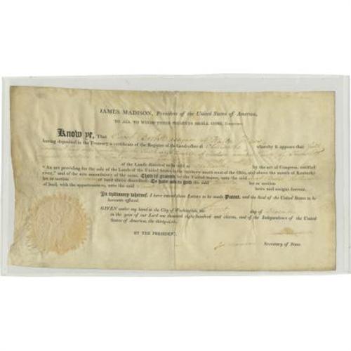 <B>James Madison and James Monroe Signed Land Indenture Document</B></I>. 15” x 8.5”, on vellum, December 1, 1811, signed “<I>James Madison</B></I>”, as president and “<I>James Monroe</B></I>”, as Secretary of State, with the seal of the United States still attached, for land sold by an Act of Congress for lands in the territory north west of Ohio. There is a small stain affecting mainly the “M” of Madison, both signatures have faded slightly, the vellum has toned at the edges and has a few wrinkles, else very good.<BR><BR><BR><b>Shipping:</b> Flat Material, Small (<a target="_blank" href="http://www.heritageauctions.com/common/shipping.php">view shipping information</a>)