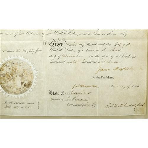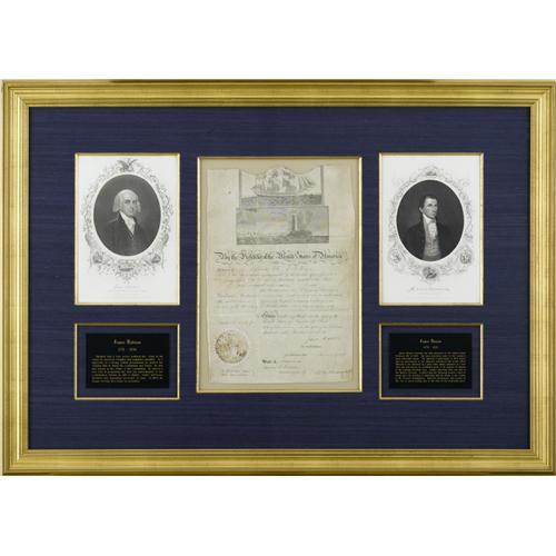 <B>James Madison and James Monroe Signed Ship's Papers Document Signed.</B></I> One page, 10.5" x 15.5", partly printed, on vellum, Baltimore, December 3, 1811, signed by Madison as president and "<I>Jas Monroe</B></I>" as secretary of state. This attractive document has the indented or scalloped top and is a pass for "the Schooner <I>Fly</B></I> of Baltimore, John Dameron, master or commander of the burthen of one hundred & thirty five 22/96th tons or thereabouts mounted with Two guns, navigated with nineteen men." Formerly Thomas Jefferson's secretary of state, Madison was our fourth president (1809-1817) and co-author of the <I>Federalist Papers.</B></I> He is traditionally regarded as the Father of the United States Constitution. James Monroe succeeded Madison as our fifth president (1817-1825) and was the author of the Monroe Doctrine. His presidency is known as the "Era of Good Feelings." This document is in fine condition with its wafer seal intact and is matted in blue silk and gilt fillets with matching vintage engravings and engraved brass plates. All framed to an overall size of 39.5" x 28.5".