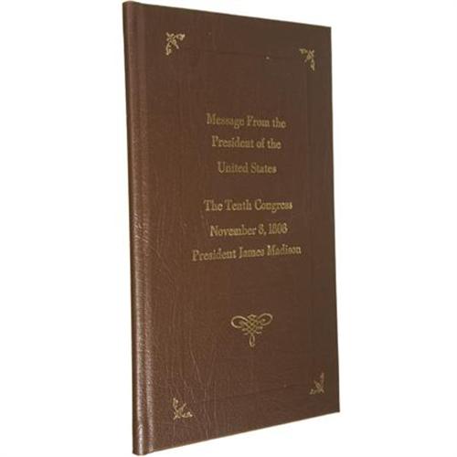 <B>James Madison, </B></I><B><I>Message from the President of the United States: The Tenth Congress, November 8, 1808</B></I></B></I> 64 pages, re-bound in brown leather with gold lettering and decorations, 8 vo (9.5â x 6â). A cut signature and date, <I>âJs. Madison, Washington, November 22, 1804â</B></I>, has been attached to the front endpaper with mylar corners. The binding is in as new condition; the paper is in poor-fair condition with considerable acidification and foxing; the autograph is in very good condition with slight fading.<BR><BR><b>Shipping:</b> Books & Catalogs (<a target="_blank" href="http://www.heritageauctions.com/common/shipping.php">view shipping information</a>)