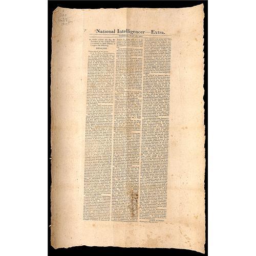 <Our item number 141126><B>[Madison, James] Broadside.</B> Printed Broadside: National Intelligencer Extra, 1p., large folio, Washington, DC, 25 May 1813, signed in type by President James Madison. A printed "Message" from the President addressed to the Senate. In small part: "…after the close of the last session of Congress an offer was formally communicated from his Imperial Majesty, the Emperor of Russia, of his meditations as the common friends of the U. States and G. Britain for the purpose of facilitating a peace between them… further proof of the disposition on the part of the U.S. to meet their adversary in honorable experiments for terminating the war… The contest in which the United States are engaged, appeals for its support, to every motive than can animate an uncorrupted and enlightened people; to an emulation of the glorious Founders of their Independence…" Although a peace treaty was signed in December 1814, the hostilities did not end until February 12, 1815. Trivial scattered stains, else very good. <BR>Estimated Value $2,000 - 2,500. <BR><BR>Our item number 141126<BR><IMAGES><P ALIGN="CENTER"><IMG SRC="http://www.goldbergcoins.net/liveauction/49jpegs/141126.jpg"> </P></IMAGES>