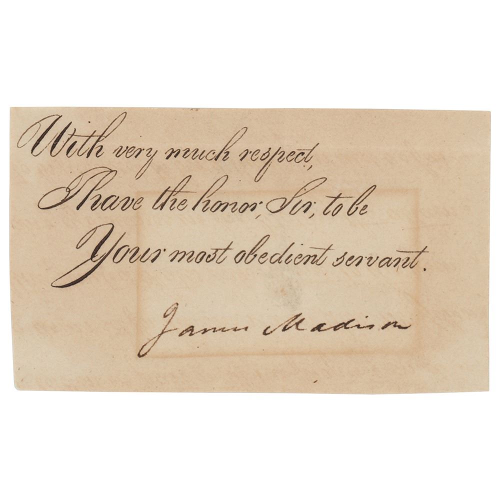 Desirable ink signature, "James Madison,‰Û on an off-white 4.25 x 2.5 slip clipped from the end of a letter, with calligraphic closing. In fine condition, with toning from prior display.