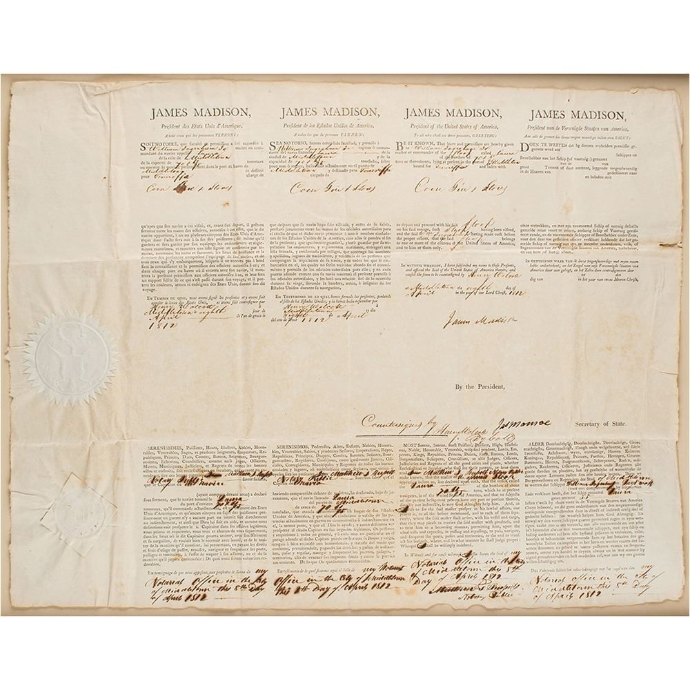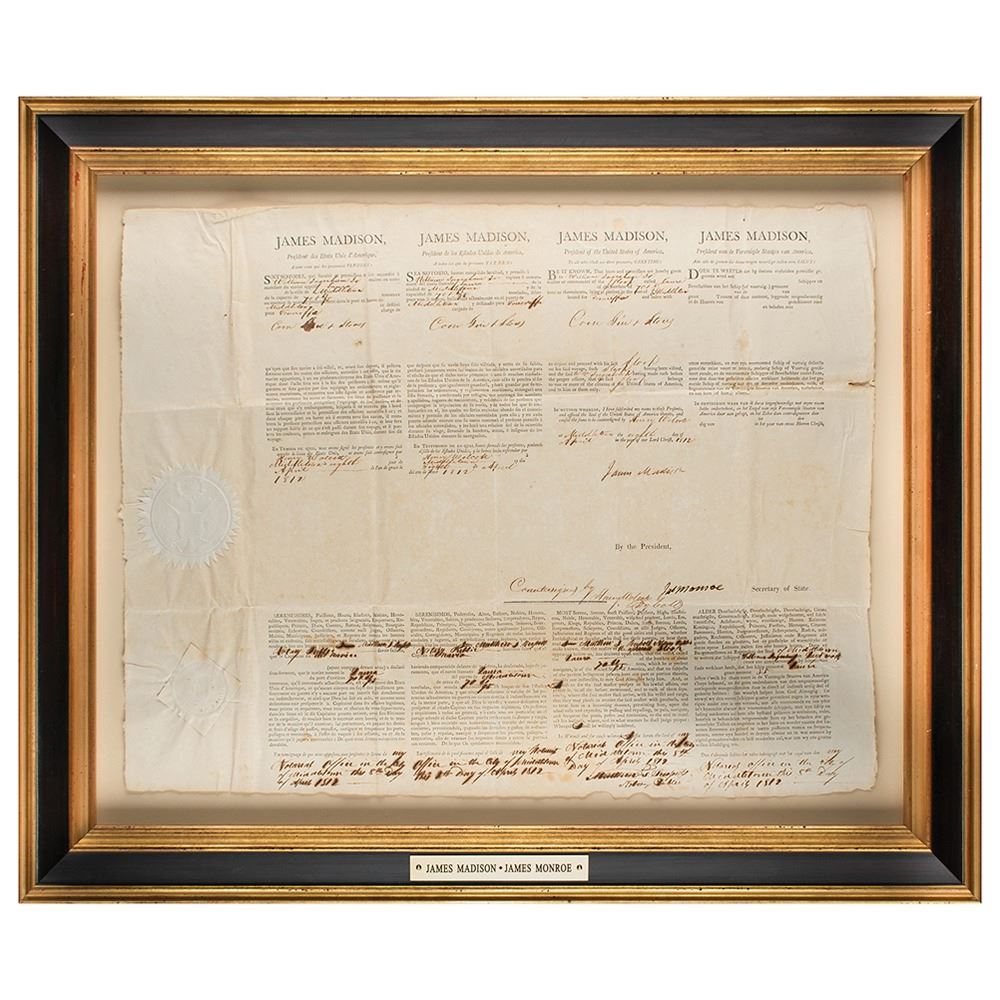 Partly-printed DS, signed ‰ÛÏJames Madison" as president and "Jas. Monroe" as secretary of state, one page, 21.25 x 16.5, April 8, 1812. Four-language ship‰Ûªs papers issued to William Ingraham, Jr., ‰ÛÏmaster or commander of the Sloop called Laura‰Û_lying at present in the port of Middletown bound for Teneriffe and laden with Corn, Gin & Stores.‰Û Boldly signed at center by President Madison and countersigned by Secretary of State Monroe. Two embossed paper seals remain intact to the lower left. Mounted and framed to an overall size of 27.25 x 22.75. In very good to fine condition, with light mottled toning, some creasing, and a small sliver of paper loss to the right edge.