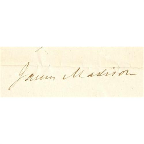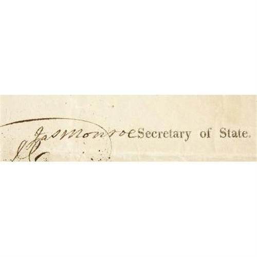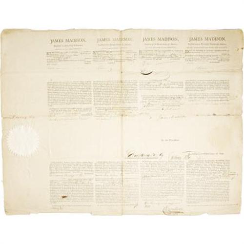 <B>James Madison and James Monroe Document Signed</B></I> 21” x 16.75”, two page (front and verso), partially printed, March 27, 1812, New York. Ships papers for the ship <I>Corporal Trim of Gloucester </B></I>sailing from Alexandria to Cadiz signed by Madison as president and Monroe as secretary of state. With the large, original paper seal. General wear and tearing at the folds, else near very good.<BR><BR><BR><b>Shipping:</b> Flat Material, Small (<a target="_blank" href="http://www.heritageauctions.com/common/shipping.php">view shipping information</a>)
