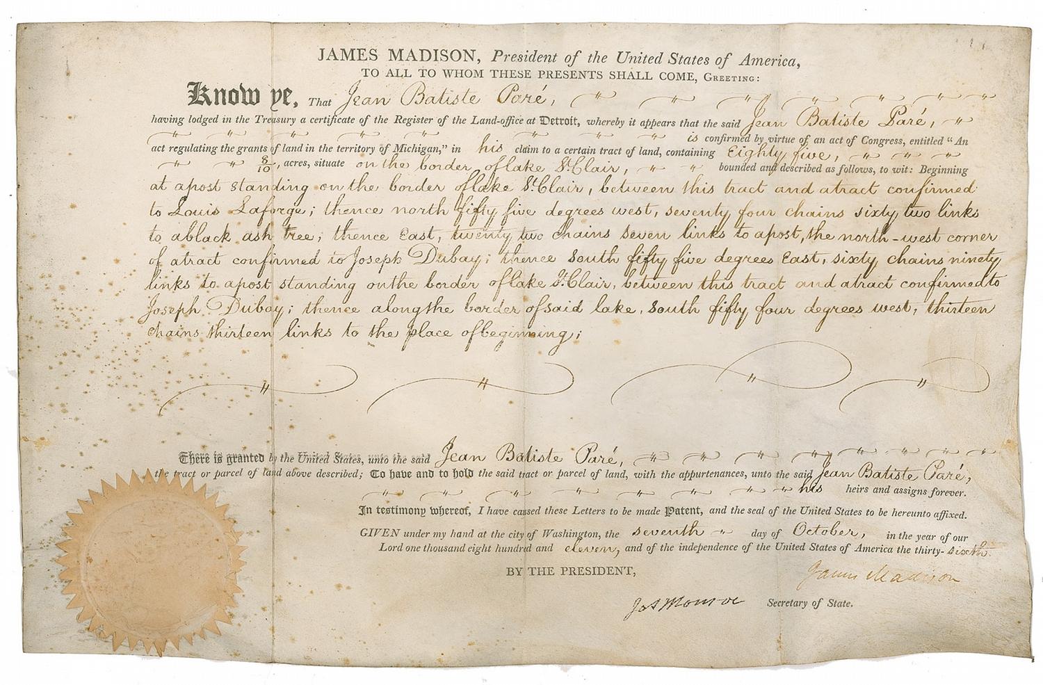 Partly-printed DS, signed “James Madison” as president and “Jas. Monroe” as secretary of state, one page, 15.5 x 10, October 7, 1811. President Madison grants Jean Batiste Pare 85 acres of land on the edge of Lake St. Claire in Michigan. Vertical folds, Madison‘s signature light, but legible, scattered wrinkling and toning, and foxing to left side, otherwise very good condition. The seal is toned and worn, but almost completely intact.