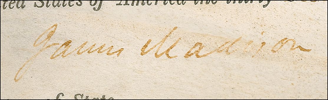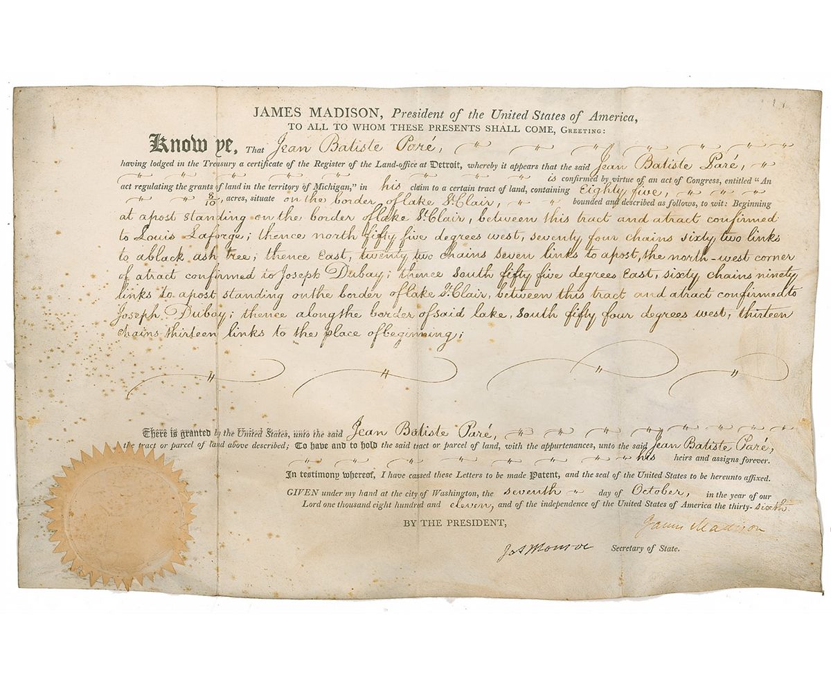 Partly-printed DS, signed “James Madison” as president and “Jas. Monroe” as secretary of state, one page, 15.5 x 10, October 7, 1811. President Madison grants Jean Batiste Pare 85 acres of land on the edge of Lake St. Claire in Michigan. Vertical folds, Madison‘s signature light, but legible, scattered wrinkling and toning, and foxing to left side, otherwise very good condition. The seal is toned and worn, but almost completely intact.