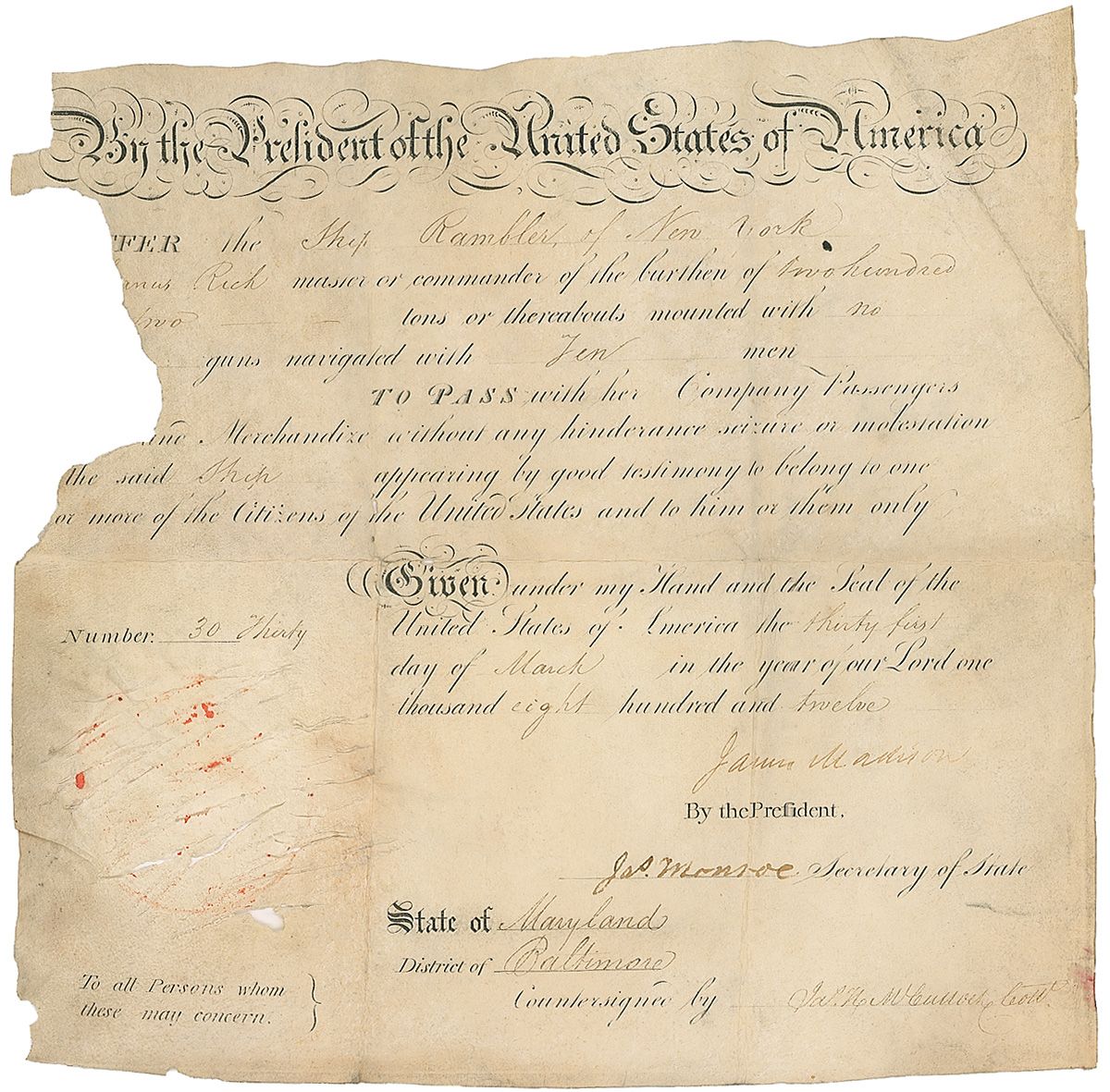 Partial partly-printed DS, signed “James Madison” as president and “Jas. Monroe” as secretary of state, one page, 10.25 x 10, March 31, 1812. Portion of a ship’s pass issued for the “Ship Rambler of New York…mounted with no guns, navigated with ten men.” Signed at the conclusion by Madison and Monroe. In good condition, with intersecting folds, one through a single letter of each signature, paper loss to left side, end of Madison’s signature fairly light, but still legible, a few other small areas of paper loss, and some light creasing and soiling. The seal is missing and document is scored where seal once was.