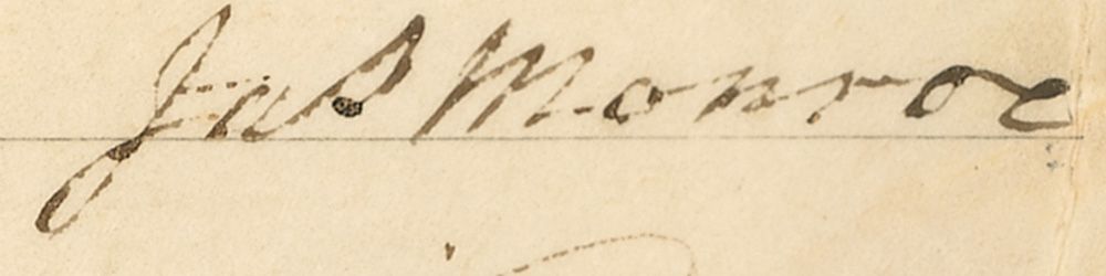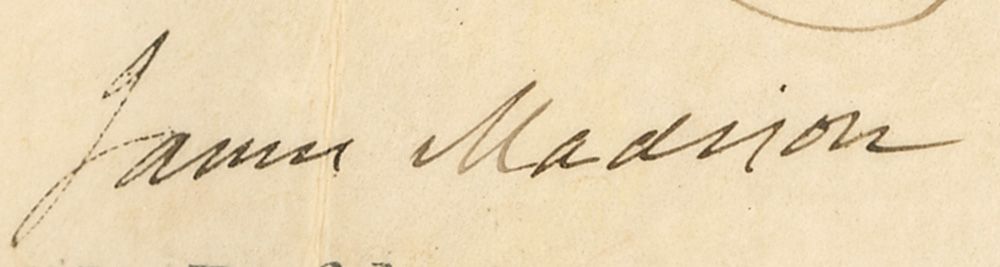Partly-printed scalloped-top vellum DS signed by Madison as president, “James Madison,” and Monroe as secretary of state, “Jas. Monroe,” one page, 10.75 x 14.75, January 31, 1817. Ship’s pass reads, in part, “Suffer the Ship Adonis of New York, Henry L. Champlin master or commander…mounted with no guns navigated with fourteen men to pass with her company passengers goods and merchandise, without any hindrance, seizure or molestation.” Fully intact seal is affixed to the lower left. Intersecting folds, one vertical fold passing through a single letter of Madison’s signature, and light scattered toning and soiling, otherwise fine condition.