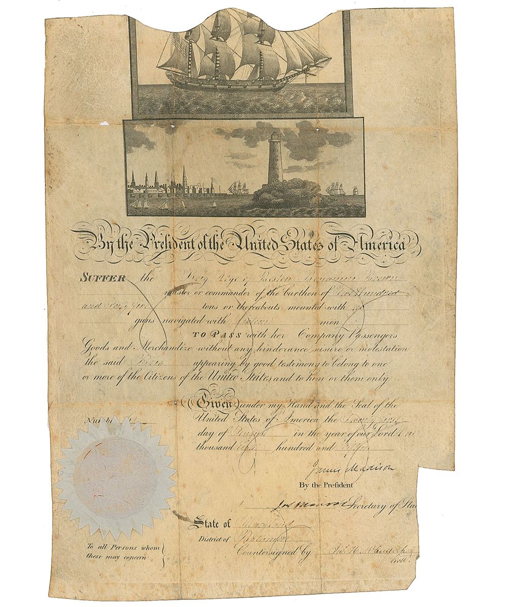 Partly-printed DS, one page, 10.75 x 15.75, August 21, 1813. Ship’s pass reads, in part, “Suffer the Brig Argo of Boston, Benjamin Browne master or commander…mounted with no guns navigated with sixteen men to pass with her company passengers goods and mer