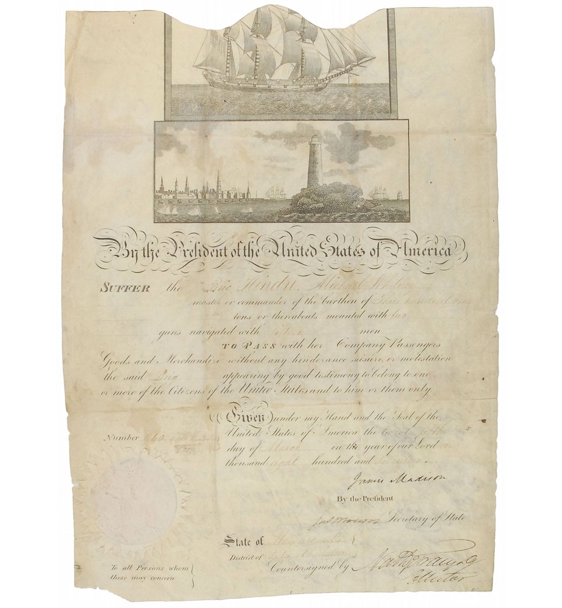 Partly-printed scallop-top vellum DS, signed “James Madison” as president and “Jas. Monroe” as secretary of state, one page, 11 x 14.75, March 15, 1817. Ship’s pass issued for “the Brig Hindu, Michael Whitney, master or commander…mounted with two guns navigated with fifteen men, To Pass with her Company Passengers Goods and Merchandize without any hinderance seisure or molestation.” Boldly signed at the conclusion by President Madison and countersigned by Secretary of State Monroe. Also endorsed on the reverse by H. A. S. Dearborn and Thomas Melvill. The white paper seal affixed to the lower left remains fully intact with creases to a few of the points. Intersecting folds (a vertical fold passing through a single letter of each signature), scattered stains, and a bit of chipping to edges, otherwise fine condition. In 1816 Captain Augustine Heard, who had commanded Boston and Salem vessels for years, observed that during the Hindu's voyage from Calcutta to Boston she sailed 7 to 7.5 knots an hour within six points of the wind, and 8.9 knots off the wind, making it a remarkably fast ship. The endorsements are also notable, as Dearborn was the son of Thomas Jefferson's secretary of war and Melvill was a participant in the Boston Tea Party. What is most unusual, however, is the date of issue—by March 15, 1817, Madison had been out of office for almost two weeks, and Monroe had succeeded him as president. The pass would have been signed well in advance and left blank, then sent to Boston where it was filled out with pertinent details. An especially interesting example of a presidential document with multiple historical associations.