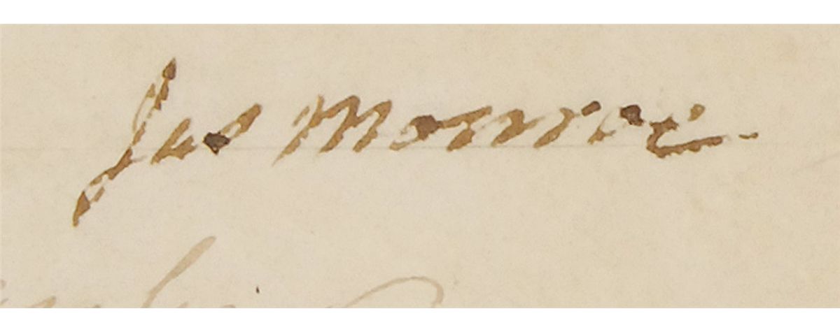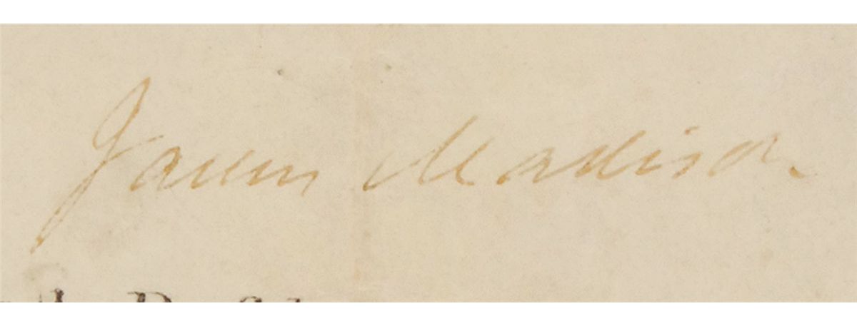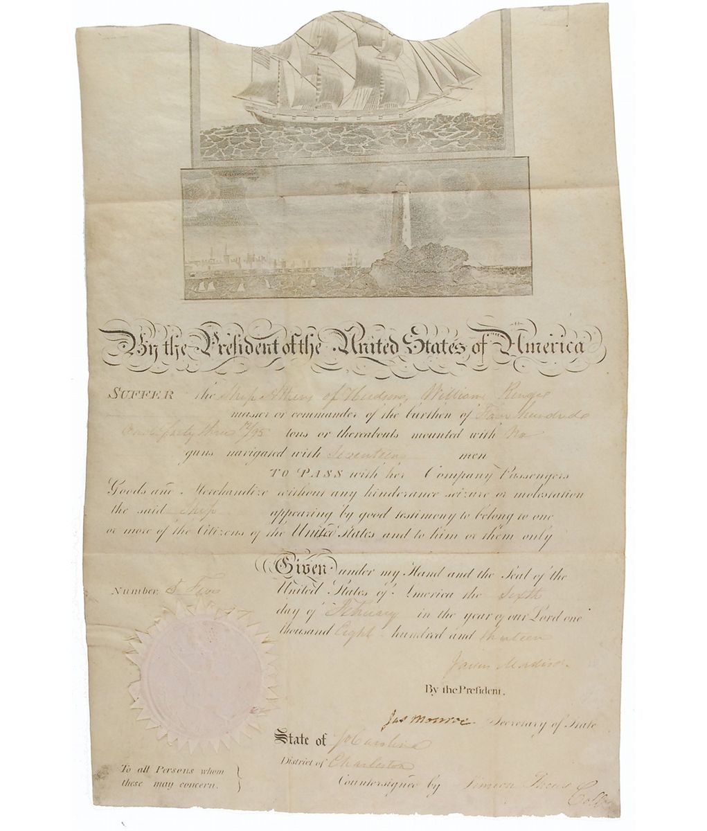 Partly-printed scallop-top vellum DS, signed “James Madison” as president and “Jas. Monroe” as secretary of state, one page, 10 x 15.25, February 6, 1813. Scallop-top ship’s pass issued for “the Ship Athens of Hudson, William Ringer, master and commander…mounted with no guns navigated with seventeen men to pass with her Company Passengers Goods and Merchandise without any hindrance seizure or molestation of the said Ship.” Signed at the conclusion by Madison and Monroe. Intersecting folds, Madison’s signature and a few handwritten portions a couple shades lighter than Monroe’s, and a bit of scattered light toning and soiling, otherwise fine condition. The white wafer seal is crisp and intact, and slightly toned at the edges.