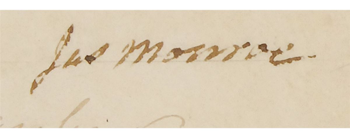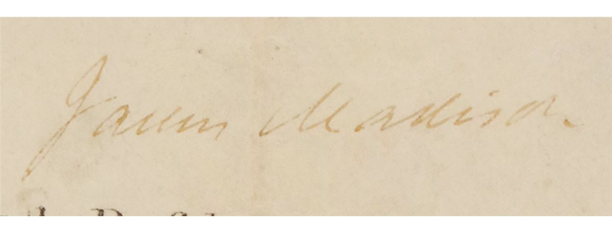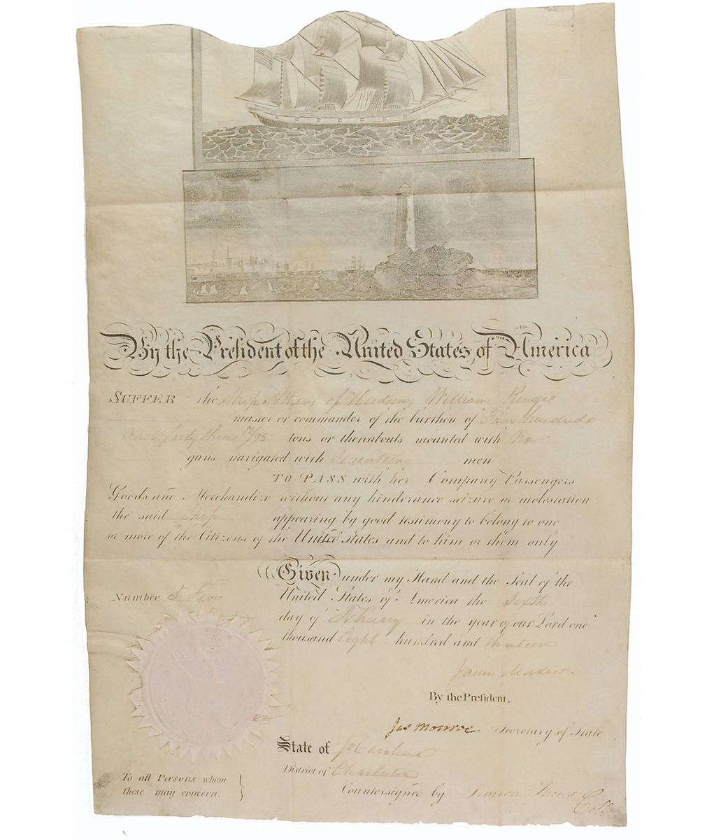 Partly-printed vellum DS, signed “James Madison” as president and “Jas. Monroe” as secretary of state, one page, 10 x 15.25, February 6, 1813. Scallop-top ship’s pass issued for “the Ship Athens of Hudson, William Ringer, master and commander…mounted with no guns navigated with seventeen men to pass with her Company Passengers Goods and Merchandise without any hindrance seizure or molestation of the said Ship.” Signed at the conclusion by Madison and Monroe. Intersecting folds, Madison’s signature and a few handwritten portions a couple shades lighter than Monroe’s, and a bit of scattered light toning and soiling, otherwise fine condition. The white wafer seal is crisp and intact, and slightly toned at the edges.