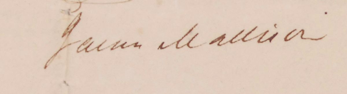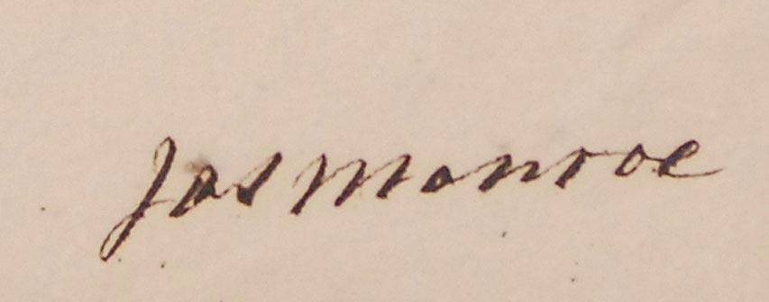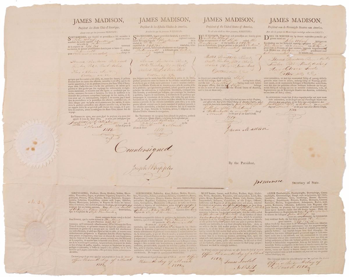 Partly-printed DS, signed “James Madison” as president and “Jas. Monroe” as secretary of state, one page, 21 x 16.5, March 7, 1812. A four-language ship’s papers issued to “John Wharf master or commander of the Ship called the Hantonia…lying at present in the port of Portsmouth bound for Cork & a market and laden with Staves, Boards & c., Pine & Oak Timber, Pot & Pearl Ashes, Hay & Clover seed, Cotton & c & c.” Some partial separations and paper loss along the fragile intersecting folds, a vertical fold passing through a single letter of Madison’s signature, and scattered edge wear and toning, otherwise very good condition. The seal is lightly toned, but crisp and intact. One of the major factors of the United States going to war was the stoppage and seizure of American vessels and sailors, which this document sought to prevent.