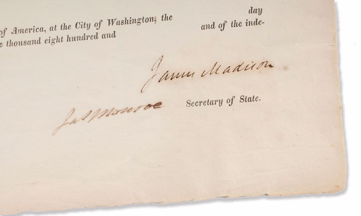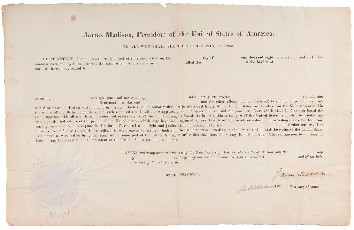 Desirable partly-printed DS, signed “James Madison” as president and “Jas. Monroe” as secretary of state, one page, 16 x 10.25, no date but circa 1812–1815. An unissued letter of marque for a privateer commission, providing official authorization for the officers and crew of a ship “to subdue, seize, and take any armed or unarmed British vessel, public or private, which shall be found within the jurisdictional limits of the United States, or elsewhere on the high seas, or within the waters of the British dominions, and such captured vessel, with her apparel, guns, and appertenances, and the goods or effects which shall be found on board the same, together with all the British persons and others who shall be found acting on board, to bring within some port of the United States; and also to retake any vessel, goods, and effects of the people of the United States, which may have been captured by any British armed vessel.” The white paper seal affixed to the lower left remains crisp and fully intact. Cleanly repaired partial separations to central vertical and horizontal folds, small circular stain to the upper left, mild haloing to Madison’s bold signature, and light chipping and toning to edges, otherwise fine condition; an overall bright, clean appearance.