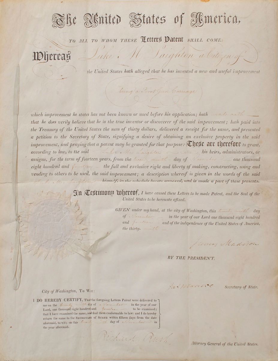 Partly-printed vellum DS as president, one page, 11.75 x 15, November 29, 1814. A patent issued to “Luke M. Laighton, a Citizen of the United States [who] hath alleged that he has invented a new and useful improvement being a Pivot Gun Carriage.” Signed at the conclusion by President Madison and countersigned by Secretary of State Monroe as well as Attorney General Richard Rush. The seal and ribbon affixed to the left edge remain intact but the second page is absent. In very good to fine condition, with intersecting folds and signatures light but legible.