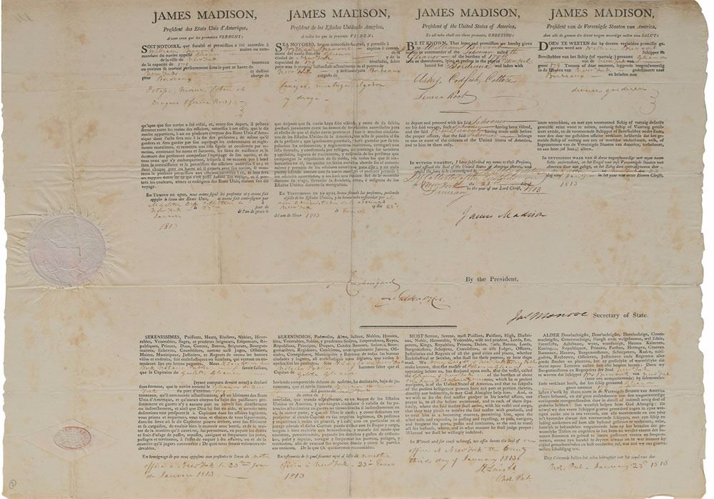 Partly-printed DS, signed "James Madison" as president and "Jas. Monroe" as secretary of state, one page, 21 x 16.5, January 23, 1813. Four-language ship's papers issued to "William Brevoort, master or commander of the Schooner called the Gleanor…lying at present in the port of New York, bound for Bordeaux and laden with Ashes, Codfish, Cotton, Seneca Root." Boldly signed in the center by President Madison and countersigned by Secretary of State Monroe. The white paper seal affixed to the left side remains intact with a couple small cracks. Removably encapsulated in a mylar sleeve. In very good to fine condition, with scattered light staining and a few small areas of paper loss.