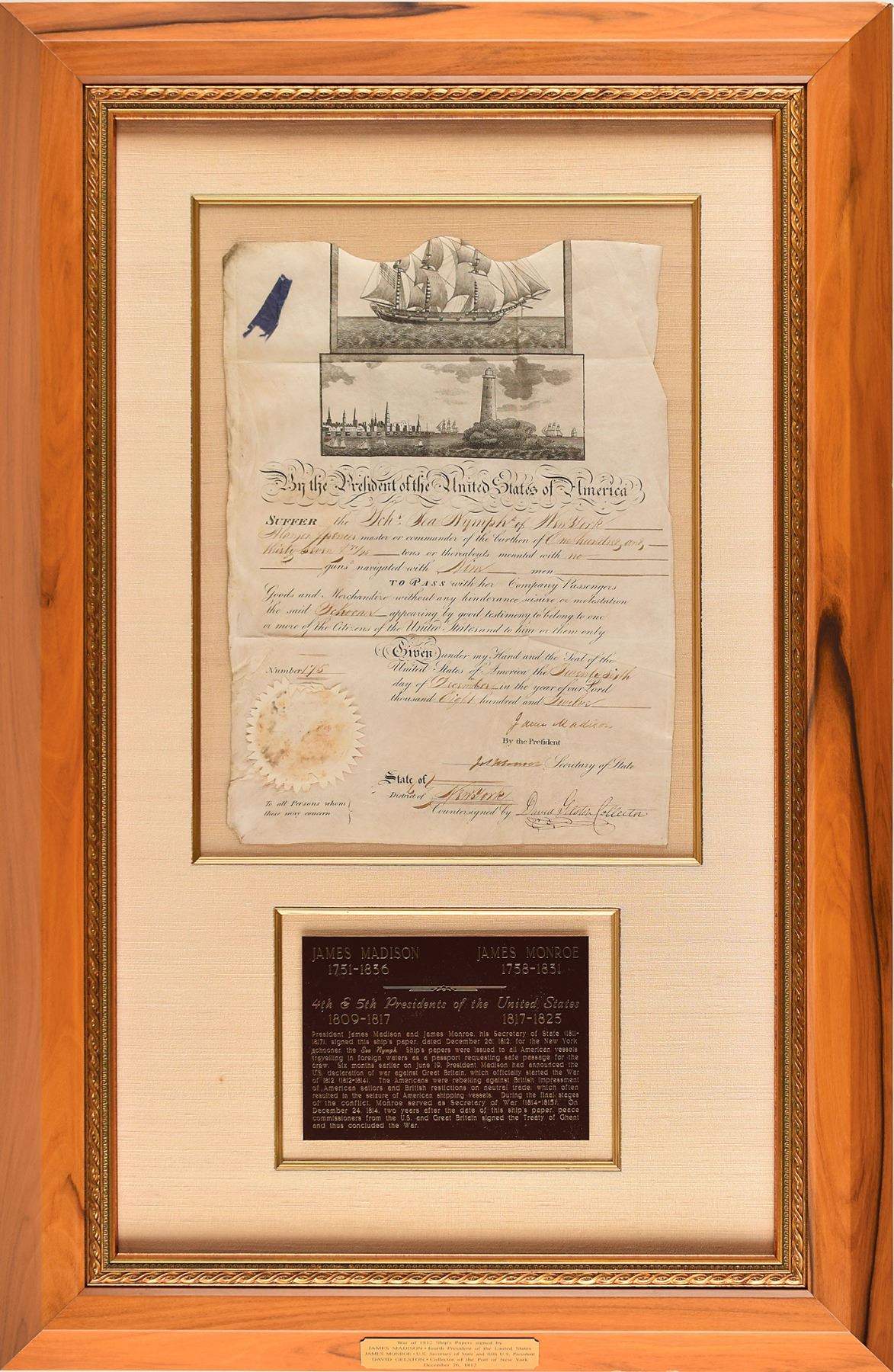 War-dated partly-printed vellum DS, signed "James Madison" as president and "Ja's Monroe" as secretary of state, one page, 11 x 15, December 26, 1812. Scallop-topped ship’s pass issued to the "Sch'r Sea Nymph of New York…mounted with no guns, navigated with nine men. To pass with her Company, Passengers, Goods and Merchandize, without any hinderance, seisure or molestation.” Signed at the conclusion by President Madison and countersigned by Secretary of State Monroe. Also countersigned by Collector of the Port of New York David Gelston, a noted merchant and politician who had been appointed to that post by Thomas Jefferson. The seal in the lower left is present, as is the remnant of a blue ribbon to upper left corner. Impressively cloth-matted and framed with a plaque to an overall size of 22 x 33.5. In very good to fine condition, with staining to the seal, and some creasing (one crease passing through Monroe's signature).