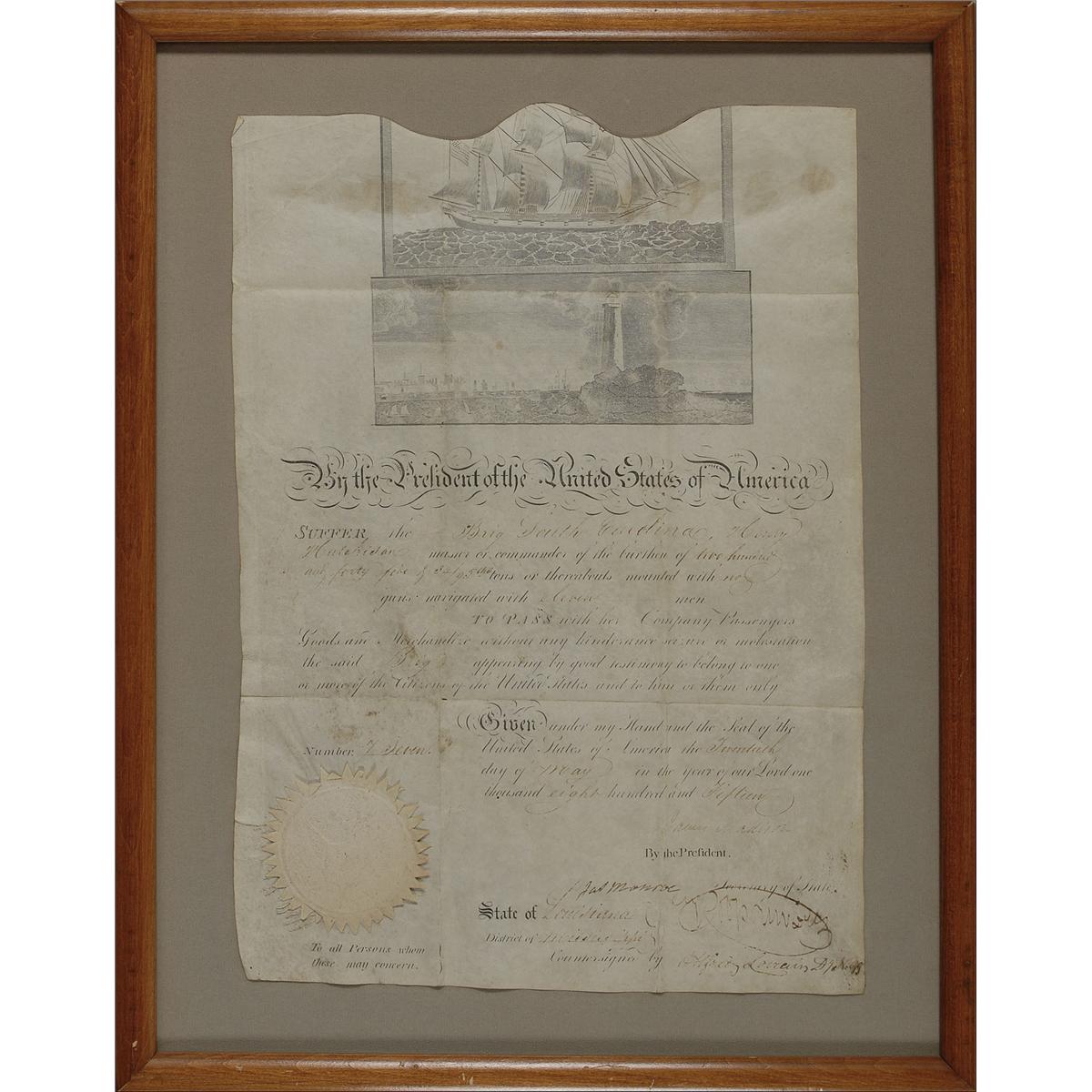 Partly printed DS, signed “James Madison” as president and “Jas. Monroe” as secretary of state, one page, 11 x 15.5, May 20, 1815. Scalloped-top ship’s pass issued for “the Brig South Carolina, Henry Hutchison, master and commander…mounted with no guns navigated with eleven men.” Signed at the conclusion by both Madison and Monroe. Framed, and apparently mounted, to an overall size of 15.25 x 19. In good to very good condition, with intersecting folds, one through a single letter of Monroe’s signature, scattered light toning, soiling and creasing, document’s handwritten text fairly light, but legible, and Madison’s signature uniformly light, but still legible. The white paper seal is toned but intact. Accompanied by a book entitled Lorrain’s Sea Sermons by Alfred Lorrain, whose countersignature appears on the bottom of the document.