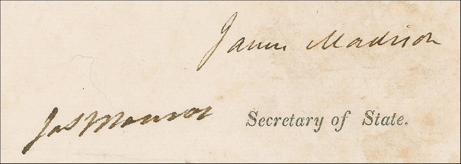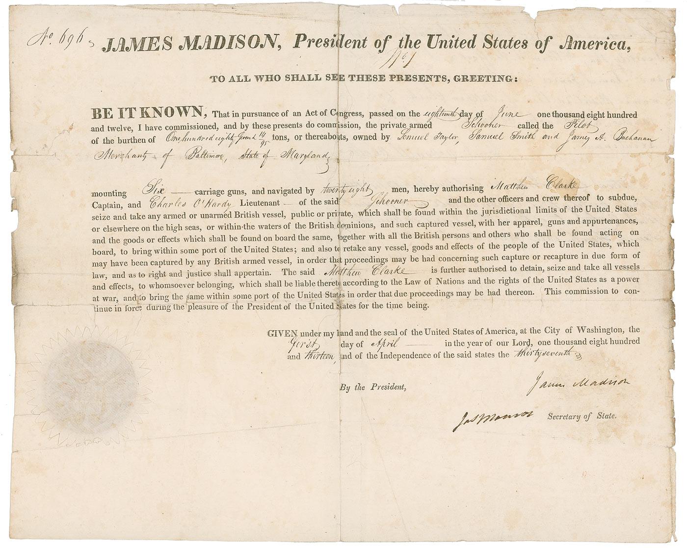 Partly-printed war-dated DS, signed by Madison as president, “James Madison,” and Monroe as secretary of state, “Jas. Monroe,” one page, 15.75 x 12.5, April 1, 1813. President Madison commissions “the private armed Schooner called the Pilot…owned by Samuel Taylor, Samuel Smith and James A. Buchanan Merchants of Baltimore, State of Maryland mounting six carriage guns, and navigated by twenty eight men, hereby authorizing Matthew Clarke Captain and Charles O’Hardy Lieutenant of the said Schooner and the officers and crew thereof to subdue, seize and take any armed or unarmed British vessel, public or private, which shall be found within the jurisdictional limits of the United States or elsewhere on the high seas…and such captured vessel, with her apparel, guns and appurtenances, and the goods or effects which shall be found on board the same, together with all British persons and others who shall be found acting on board, to bring within some port of the United States.” Intersecting folds, scattered edge wear, tears, and paper loss, two small tears to body, scattered light toning and foxing, a bit lightly affecting Madison’s signature, and some pinhole areas of paper loss, otherwise very good condition. Both signatures are largely unaffected by the document’s flaws.