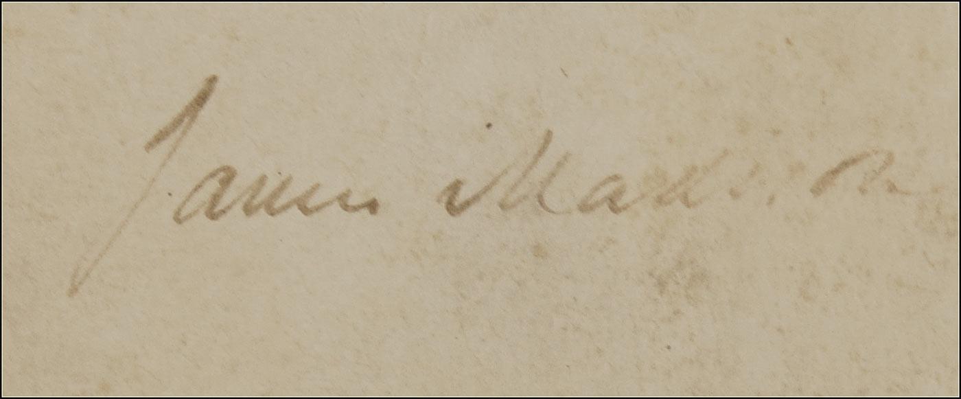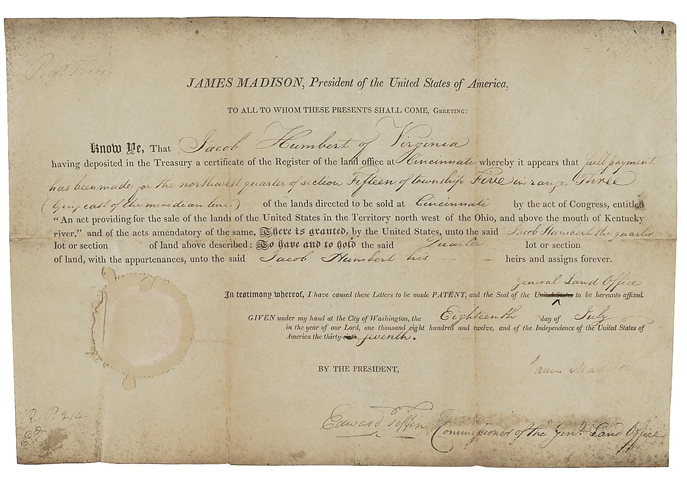 Partly-printed DS as president, one page, 14.5 x 10, July 18, 1812. President Madison grants a parcel of land to Jacob Humbert of Virginia under an “Act of Congress entitled ‘An Act providing for the sale of the Lands of the United States in the territory north-west of the Ohio and above the mouth of the Kentucky River.’” Signed at the conclusion by Madison, and countersigned by Commissioner of the General Land Office Edward Tiffin. Intersecting folds, Madison’s signature several shades light, with a few letters of last name very faint, scattered moderate toning and soiling, and several small notations, otherwise very good condition. The white wafer seal is toned and worn, but intact.