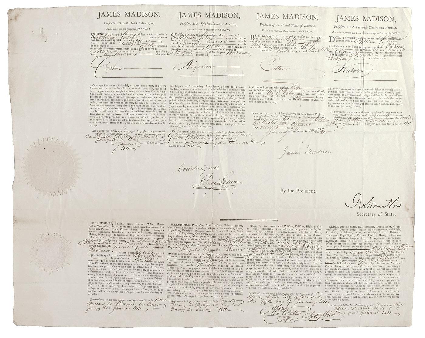 Partly printed DS as president, signed “James Madison,” one page, 20.25 x 16.25, January 5, 1811. A four-language ship’s papers issued to William C. Tobin, “master or commander of the ship called Rebecca…lying at present in the port of New York, bound for Bordeaux and laden with Cotton….” Signed in the middle by Madison and countersigned by Secretary of State R[obert] Smith. In very good condition, with intersecting folds, scattered wrinkles and small creases (faint wrinkles lightly touching signature), a touch of mild soiling to perimeter, small tears to blank portion at upper left,and scattered edge wear. Two embossed paper seals remain intact at left center. One of the more desirable presidential document formats.