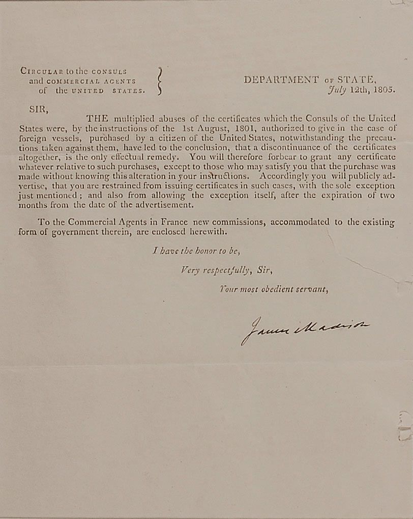 LS, as secretary of state, one page, 7.25 x 9, July 12, 1805. A printed “Circular to the Consuls and Commercial Agents of the United States" instructing them to cease the issuance of old certificates issued to Americans purchasing foreign vessels. In full: “The multiplied abuses of the certificates which the Consuls of the United States were, by the instructions of the 1st August, 1801, authorized to give in the case of foreign vessels, purchased by a citizen of the United States, notwithstanding the precautions taken against them, have led to the conclusion, that a discontinuance of the certificates altogether, is the only effectual remedy. You will therefore forbear to grant any certificate whatever relative to such purchases, except to those who may satisfy you that the purchase was made without knowing this alteration in your instructions. Accordingly you will publicly advertise, that you are restrained from issuing certificates in such cases, with the sole exception just mentioned; and also from allowing the exception itself, after the expiration of two months from the date of the advertisement. To the commercial Agents in France new commissions, accommodated to the existing from of government therein, are enclosed herewith.” Matted and framed to an overall size of 12.25 x 14. In very good condition, with a tear to right edge, as well as three smaller tears along right edge.