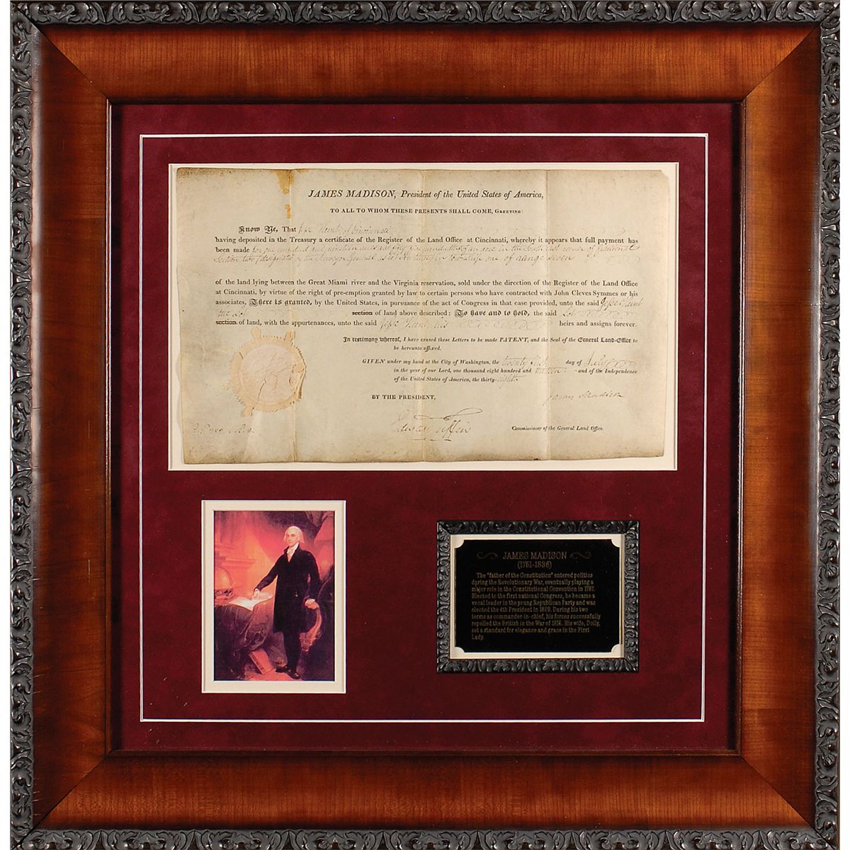 Partly-printed DS as president, one page, 14.5 x 9, July 21, 1813. Madison grants a little over 119 acres of land in Ohio to Jesse Hunt of Cincinnati. Signed at the bottom by Monroe and countersigned by Commissioner of the General Land Office Edward Tiffin. Suede matted and framed with a portrait and a biographical plaque to an overall size of 25 x 25.75. In very good condition, with three vertical folds, one through a single letter of signature, Madison’s signature and written portions of the document a shade or two light, but completely legible, and scattered toning and soiling. The paper seal is toned and cracked, but mostly intact. Oversized.