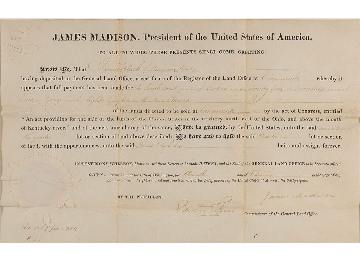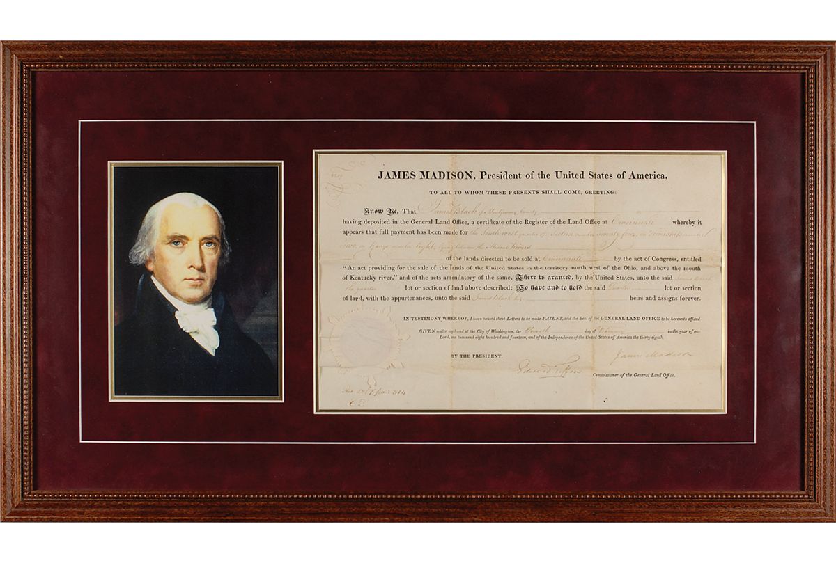Partly-printed DS as president, one page, 13.25 x 8.5, February 11, 1814. President Madison grants James Black a tract of land in Ohio, “lying between the Miami Rivers.” Signed at the conclusion by Madison and countersigned by Commissioner of the General Land Office Edward Tiffin. Double suede matted and framed with a color portrait of Madison to an overall size of 28 x 16. In very good condition, with moderate intersecting folds, and some scattered light toning and wrinkling. The white seal is intact. Oversized.