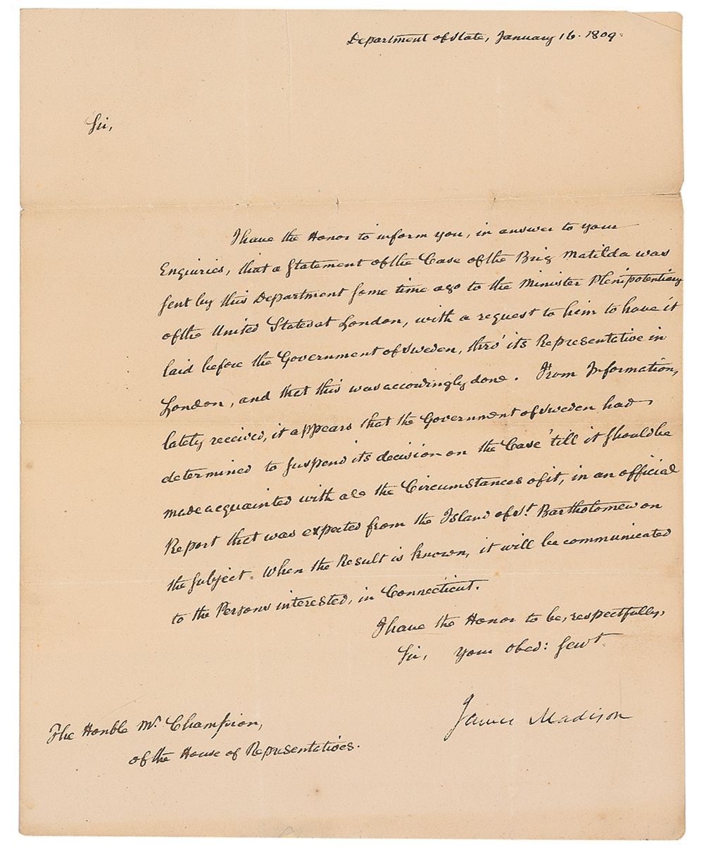 LS, one page, 8 x 9.75, January 16, 1809. Letter to Connecticut representative Epaphroditus Champion. In full: “I have the honor to inform you, in answer to your Enquiries, that a statement of the case of the Brig Matilda was sent by this Department some time ago to the Minister Plenipotentiary of the United States at London, with a request to him to have it laid before the Government of Sweden, thro’ its Representative in London, and that this was accordingly done. From information lately received, it appears that the Government of Sweden had determined to suspend its decision on the Case ‘till it should be made acquainted with all the Circumstances of it, in an official Report that was expected from the Island of St. Bartholomew on the subject. When the result is known, it will be communicated to the persons interested in Connecticut.” In very good condition, with intersecting folds, one through a single letter of signature, scattered toning and wrinkling, and some trivial paper loss to blank integral second page.