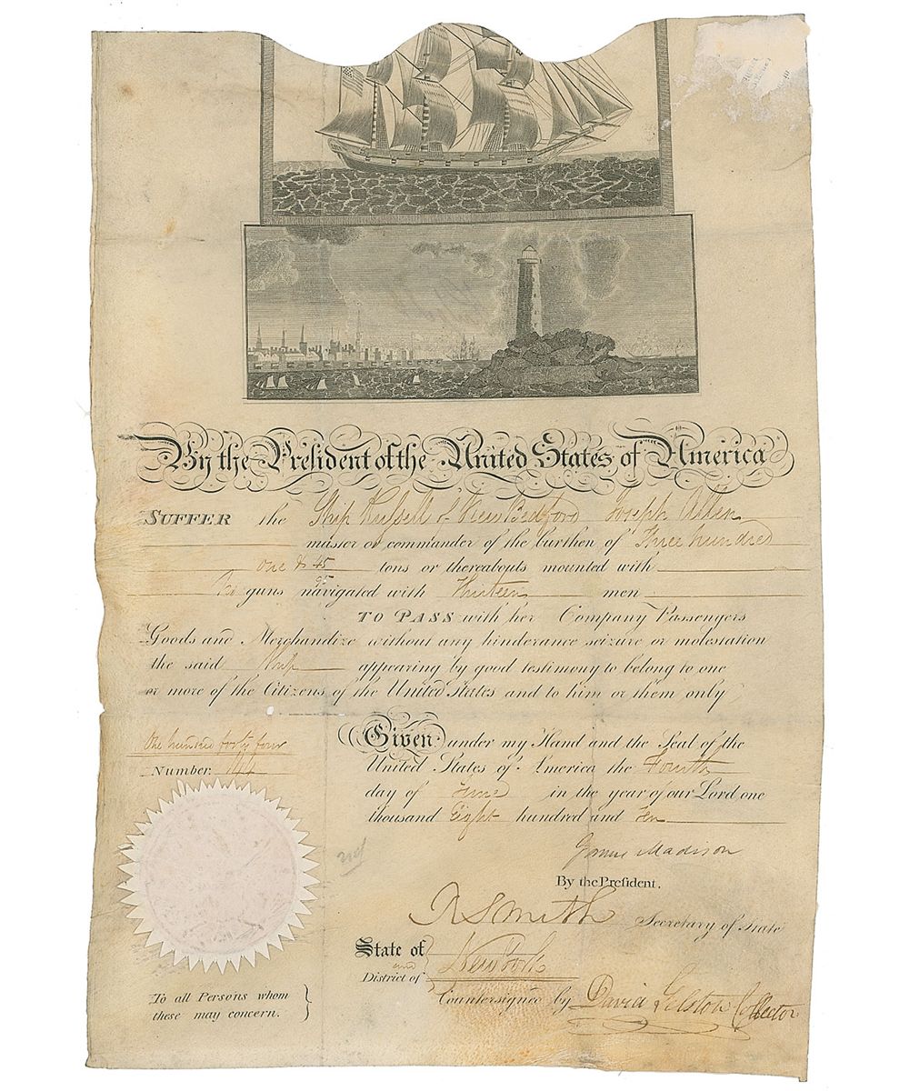 Partly-printed vellum DS as president, one page, 11 x 15, June 4, 1810. Scalloped-top ship’s pass reads, in part: “Suffer the Ship Russell of New Bedford, Joseph Allen master or commander…mounted with no guns navigated with thirteen men to pass with her c
