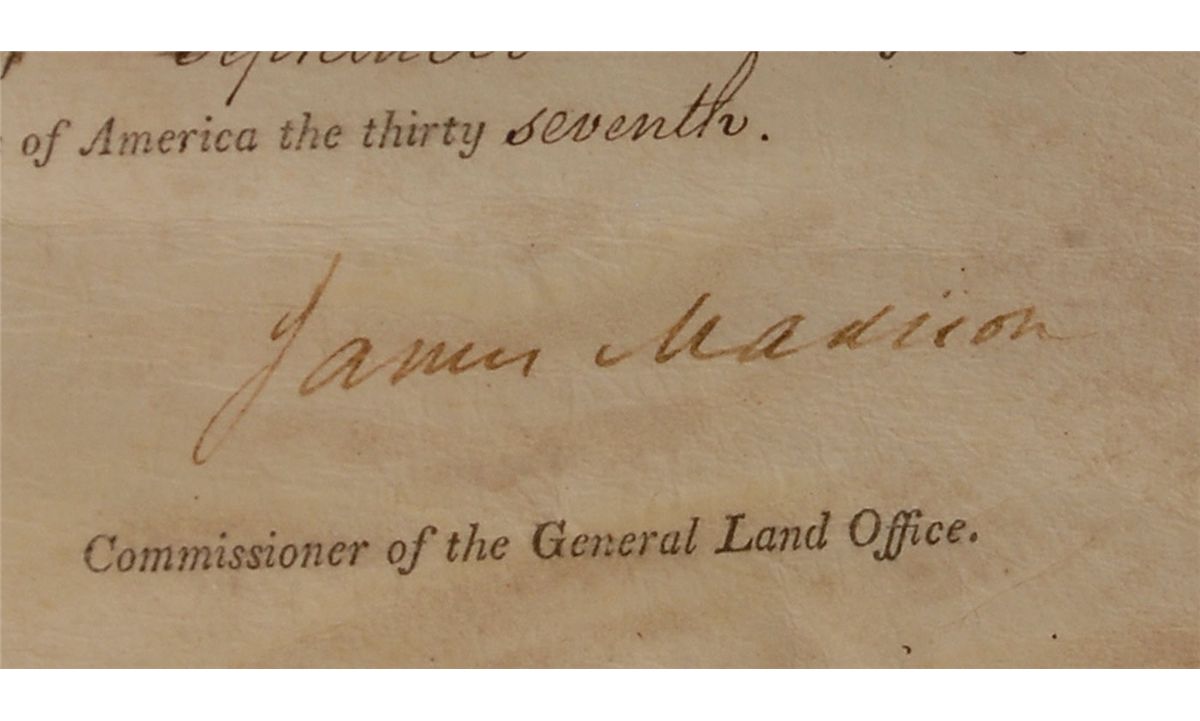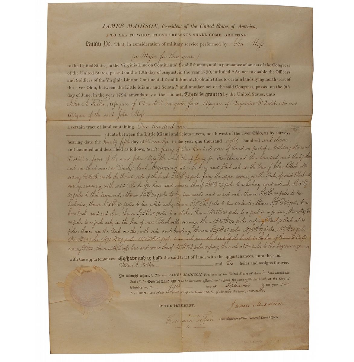 Partly-printed DS as president, one page, 12 x 16, September 5, 1812. Land grant for 100 acres of land reads, in part: “Know ye, That, in consideration of military service performed by John Moss, (a Major for three years) to the United States, in the Virginia Line on Continental Establishment, and in pursuance of an Act of the Congress of the United States passed on the 10th day of August, in the year 1790, intituled ‘An act to enable the Officers and Soldiers of the Virginia Line on Continental Establishment, to obtain titles to certain lands lying north west of the river Ohio, between the Little Miami and Sciota.’” Signed at the conclusion by Madison and countersigned by Commissioner of the General Land Office Edward Tiffin. In very good condition, with intersecting folds, scattered toning, creasing, and wrinkling. Rolled.