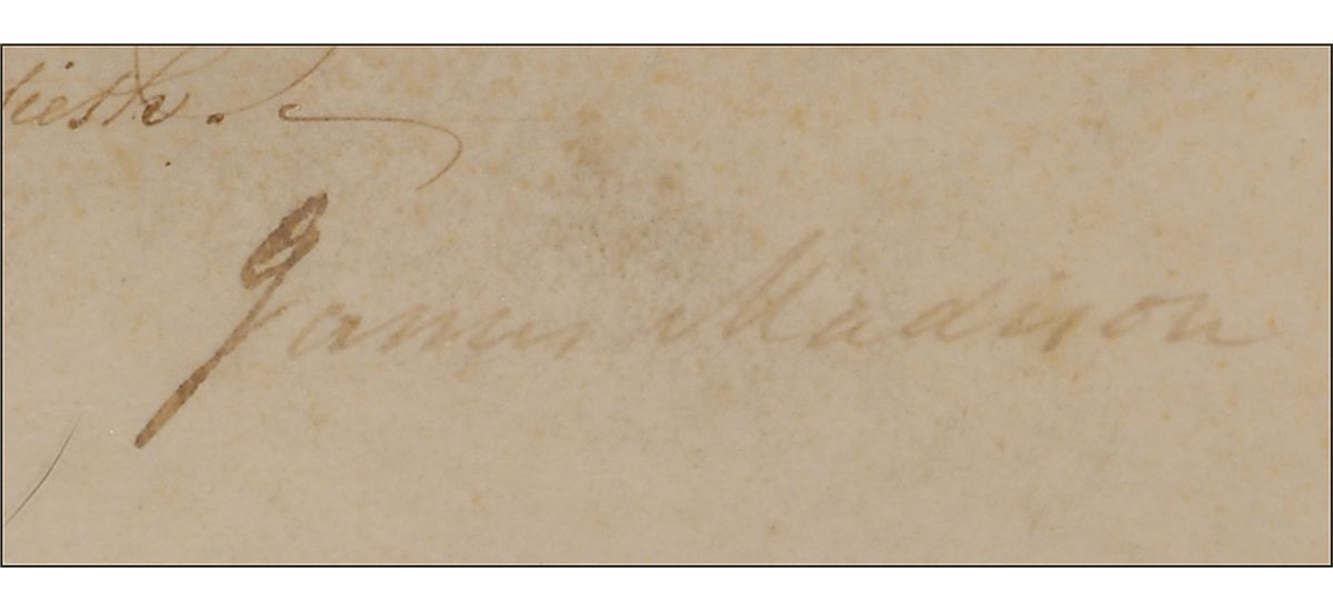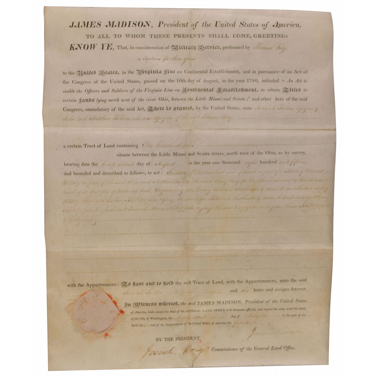 Partly-printed vellum DS as president, one page, 12 x 15, November 22, 1815. Scarce military land grant, in part: “In consideration of Military Service performed by Thomas Ray, a Captain for three years to the United States, in the Virginia Line on Continental Establishment,” President Madison grants “a certain Tract of land containing One hundred acres situate between the Little Miami and Sciota rivers north west of the Ohio.” Signed at the conclusion by Madison and countersigned by Josiah Meigs as commissioner of the General Land Office. White paper seal affixed to lower left remains intact with light foxing and general wear. In very good condition, with intersecting folds, light scattered soiling, and Madison’s signature a couple shades light.
