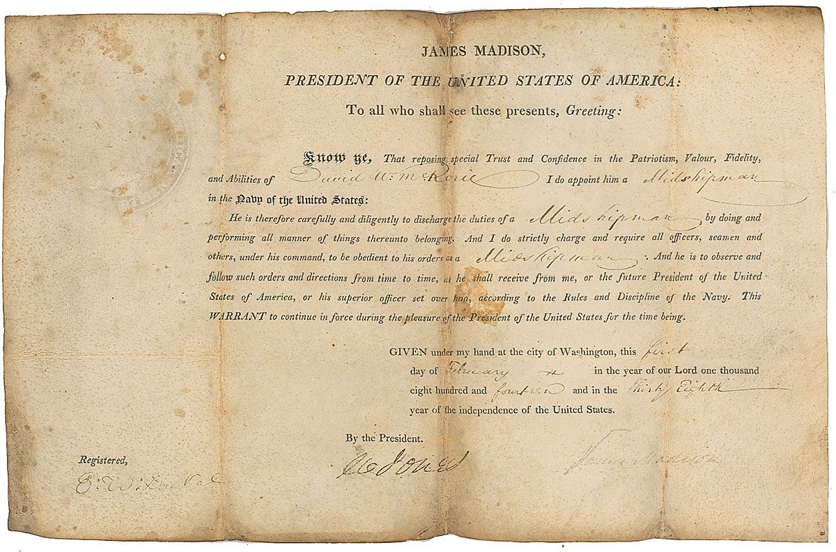 Partly-printed vellum DS as president, one page, 12.5 x 8, February 14, 1814. President Madison appoints David W. McRorie as “a Midshipman in the Navy of the United States.” Signed at the conclusion by Madison and countersigned by Secretary of the Navy William Jones. Heavy intersecting folds (one vertical fold passing through a single letter of the signature), scattered staining and soiling, and signature very light but legible, otherwise very good condition.