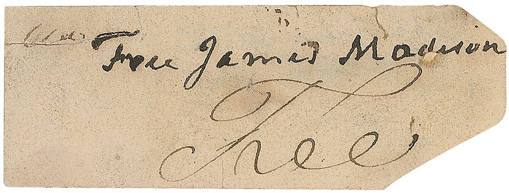 Bold ink franking signature, “Free James Madison,” with “Free” written underneath in an unknown hand, on an irregularly clipped slip taken from another envelope. Slip is affixed to a 5.5 x 3.5 off-white card. In fine condition, with a bit of scattered light soiling and closely trimmed eges.